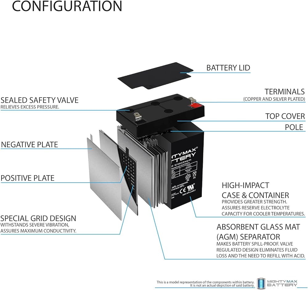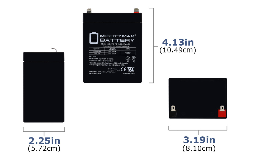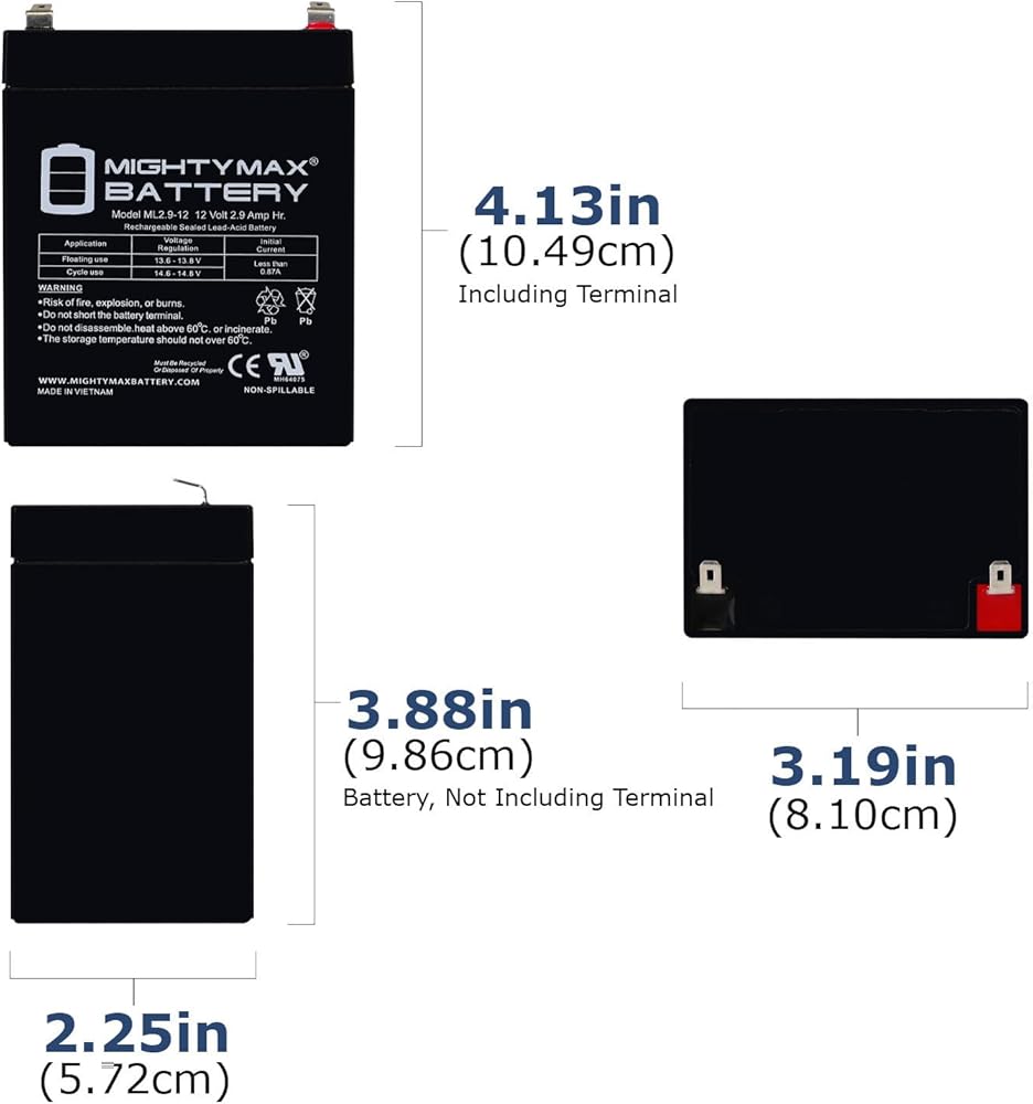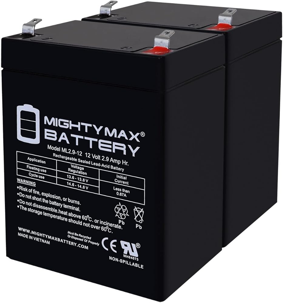 - ML2.9-12 SLA عبارة عن بطارية حمض الرصاص المختومة (SLA) بقدرة 12 فولت 2.9 أمبير قابلة لإعادة الشحن ولا تحتاج إلى صيانة، عبوة من قطعتين - معتمدة من UL