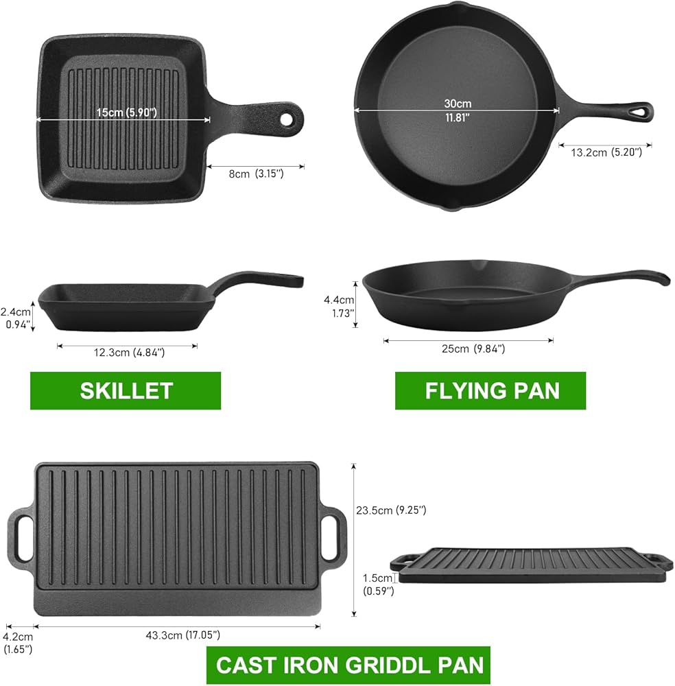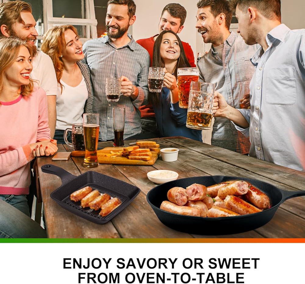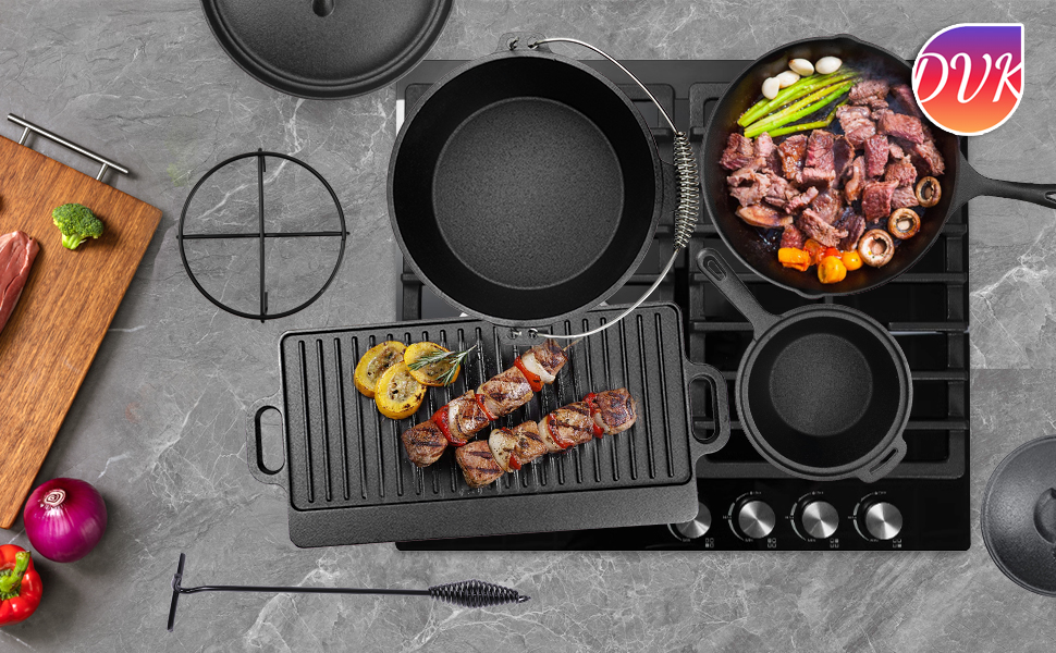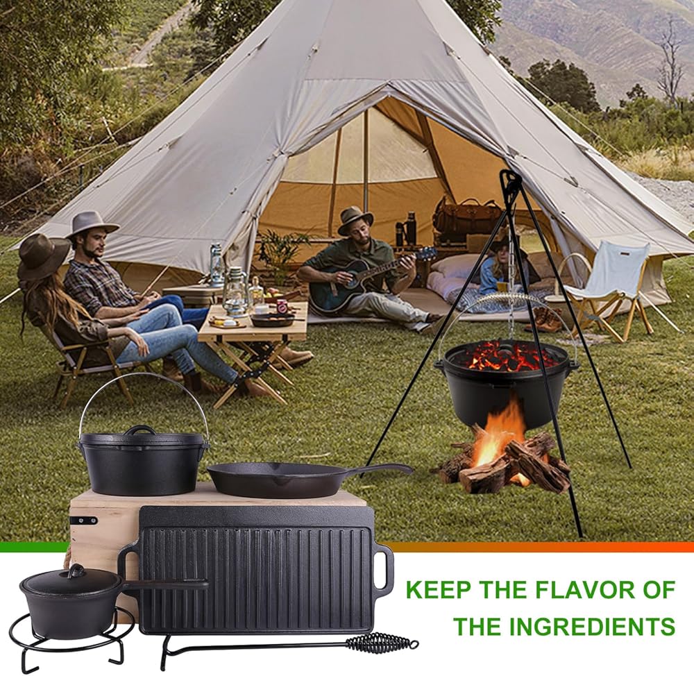 مجموعة الطبخ الشاملة: تتضمن المجموعة المكونة من 8 قطع عناصر أساسية للطهي في الهواء الطلق، مثل وعاء فرن هولندي بسعة 4.5 لتر، ووعاء صلصة، ومقلاة شواء، وأدوات متنوعة. هذا التنوع يجعله مناسبًا لإعداد مجموعة واسعة من الوجبات أثناء التخييم أو في المنزل