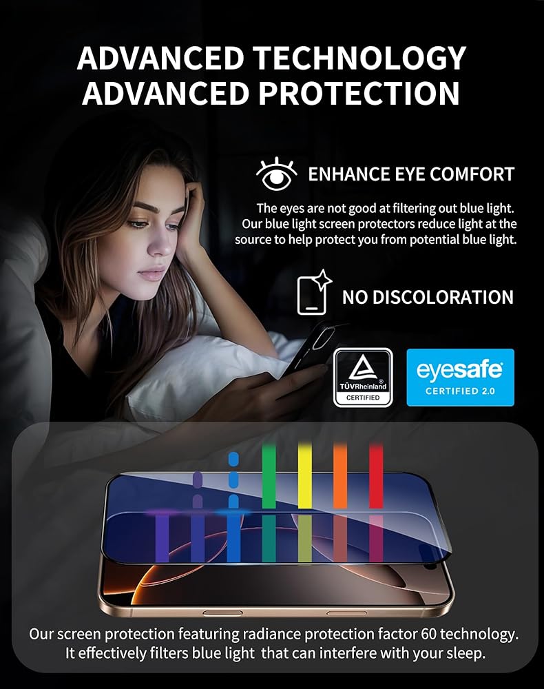• [EYE-SAFE Anti-Blue Light] يتميز واقي الشاشة iPhone 15 Pro الخاص بنا بطبقة RPF60 معتمدة من EYE-SAFE والتي تعمل على ترشيح الضوء الأزرق HEV الضار (نطاق 435-440 نانومتر). تعمل هذه التقنية المتقدمة على تقليل إجهاد العين والتعب الناتج عن قضاء وقت طويل أمام الشاشة بشكل فعال. تم تصميم هذا الواقي للحفاظ على الألوان النابضة بالحياة مع حماية بصرك، وهو مثالي للاعبين وأي شخص يقضي ساعات طويلة على أجهزته، مما يوفر وضوحًا بصريًا استثنائيًا ودفاعًا قويًا للشاشة.