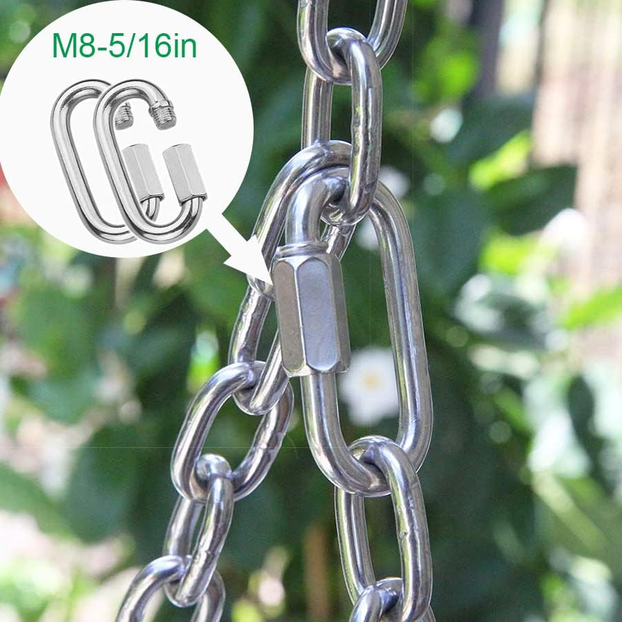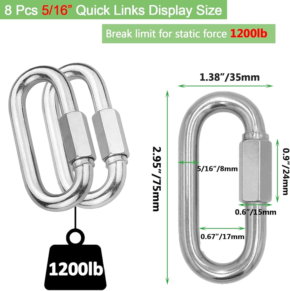 حلقة تثبيت شديدة التحمل 5/16 انش: تأتي العبوة مع 8 حلقات سلسلة سريعة؛ المقاس: قطر 5/16 انش، الطول الكلي لحلقة التثبيت شديدة التحمل هنا 3 انش، وصلة سريعة بعرض 1.4 انش تسمح لك بتوصيل سلسلتين دون قطع