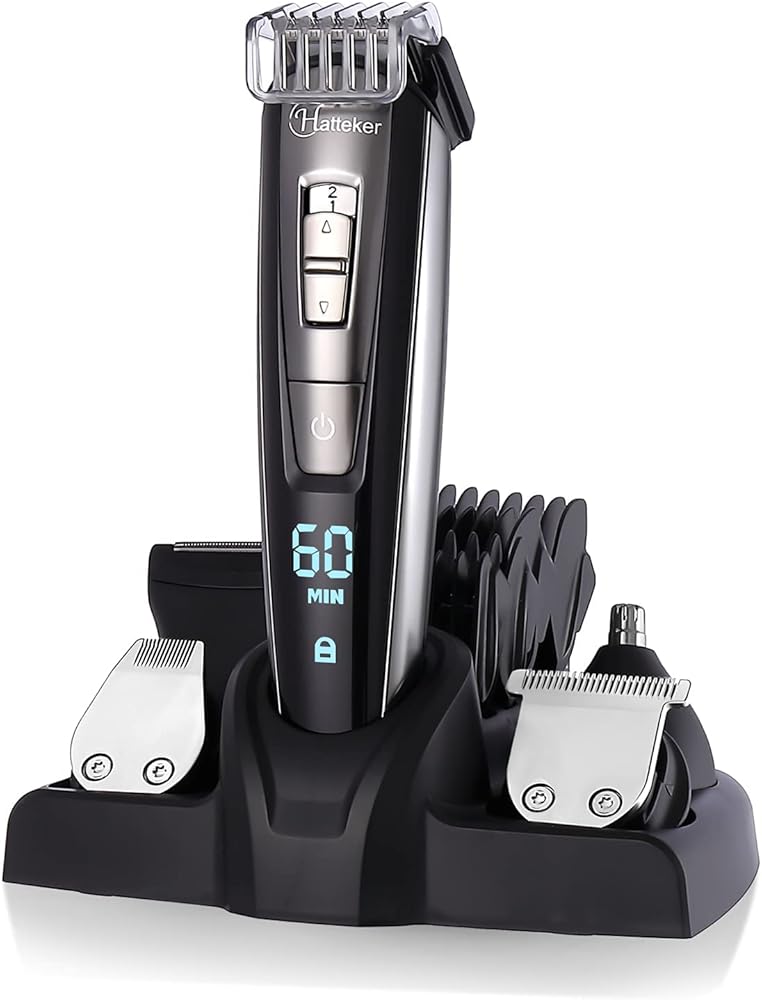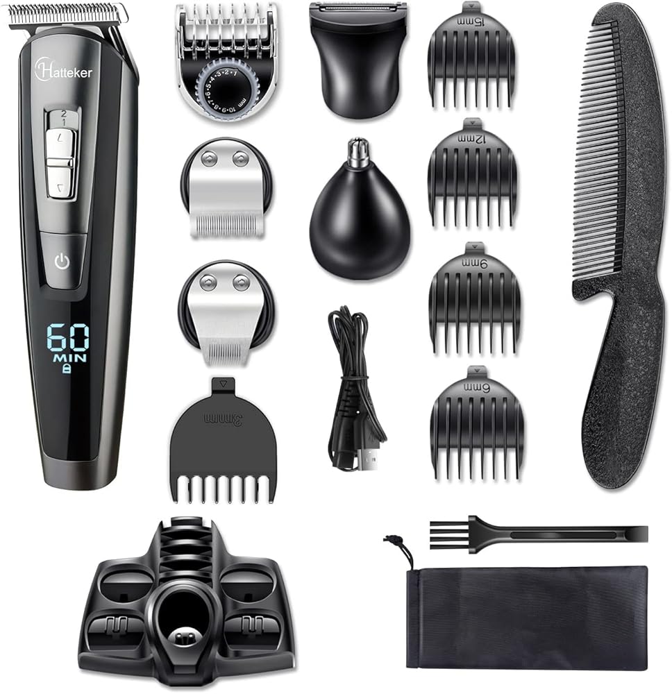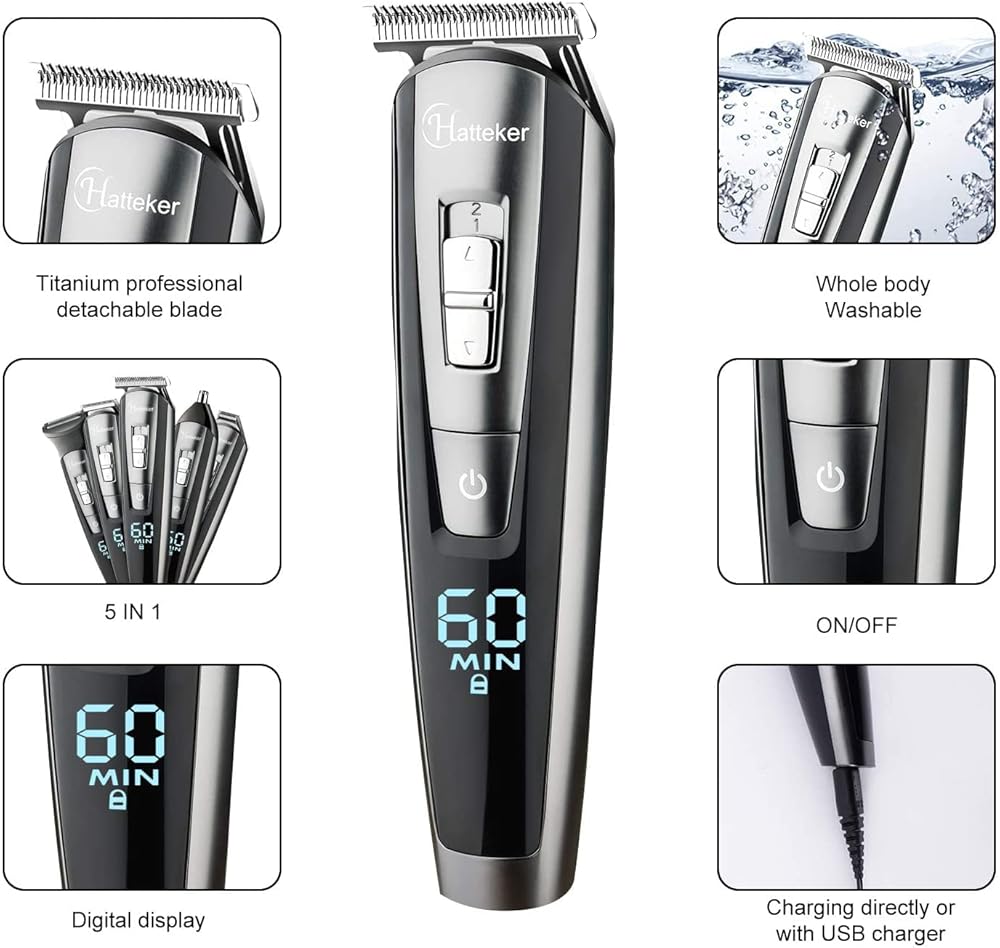 مجموعة أدوات تشذيب اللحية من Hatteker للرجال، ماكينة تشذيب الشعر والشارب بدون سلك، مجموعة أدوات تشذيب الشعر الدقيقة، مقاومة للماء، قابلة لإعادة الشحن عبر USB 5 في 1