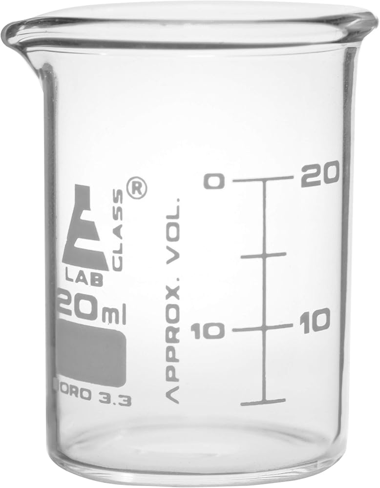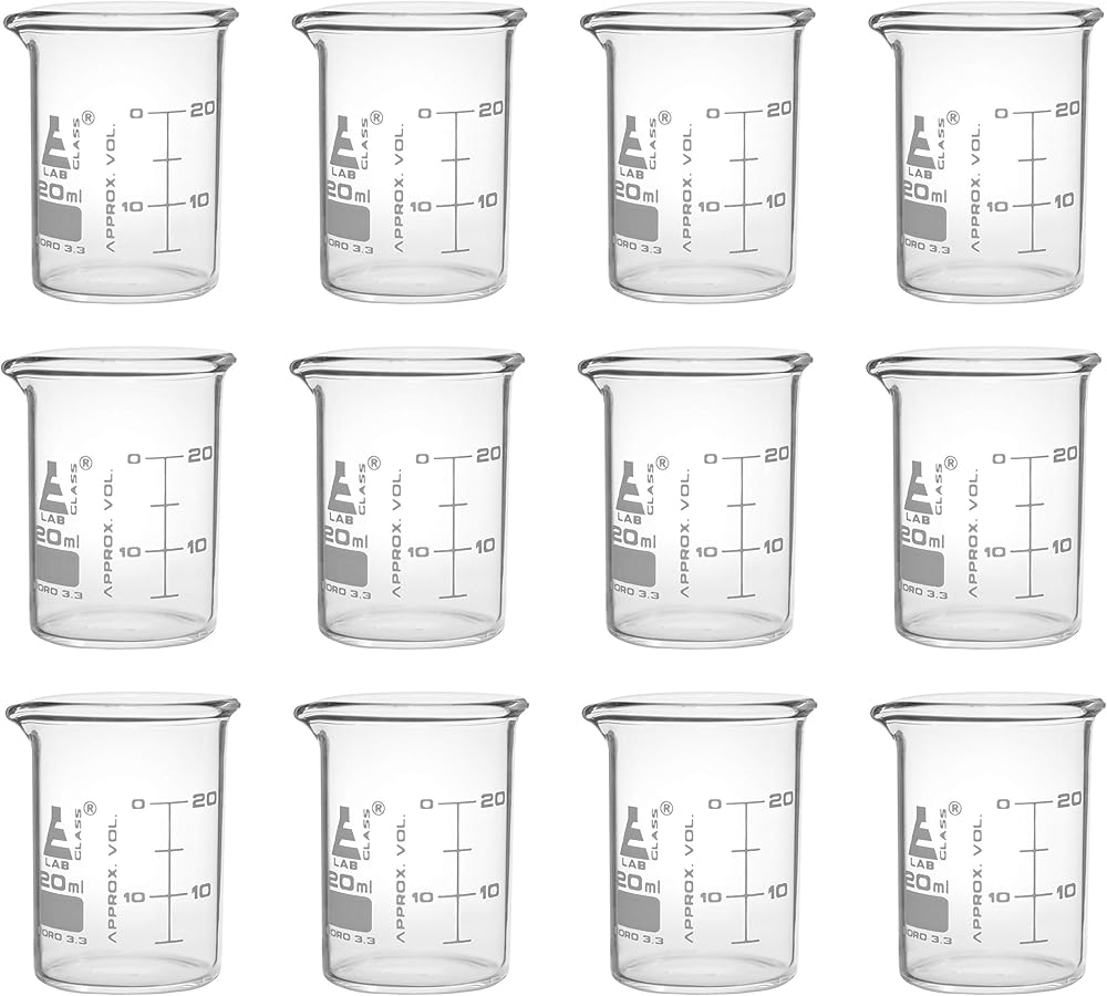 عبوة من 12 كوب بسعة 20 مل، أكواب منخفضة الشكل مصنوعة من زجاج البوروسيليكات 3.3. يتميز كل كوب بمقياس تخرج مزدوج، وفقًا للجمعية الأمريكية لاختبار المواد E960، مع خطوط تخرج كل 5 مل. فوهات لسهولة الصب. توفر الجدران الموحدة قوة ممتازة ضد الكسر.