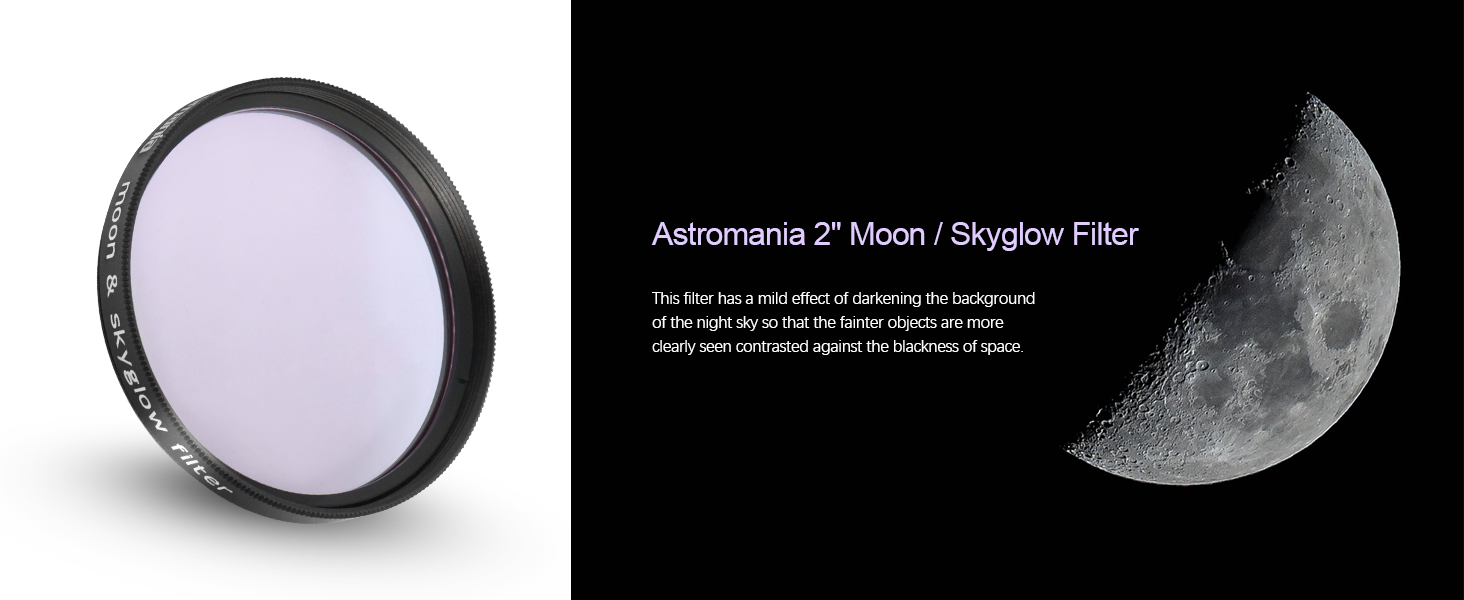 • يعد Moon & Skyglow مرشحًا متعدد النطاقات ينقل نسبة عالية من الضوء في الطيف المرئي. يعمل المرشح على تحسين التباين عند مراقبة الأجسام الأكثر سطوعًا بما في ذلك القمر والكواكب. كما أنه سيمنع توهج السماء الناتج عن الإضاءة الاصطناعية وتوهج الخلفية المنعكس عند ظهور القمر. يتمتع المرشح بتأثير معتدل يتمثل في تعتيم خلفية السماء ليلاً بحيث يمكن رؤية الأجسام الخافتة بشكل أكثر وضوحًا مقارنة بسواد الفضاء. سوف يناسب الفلتر الجميع