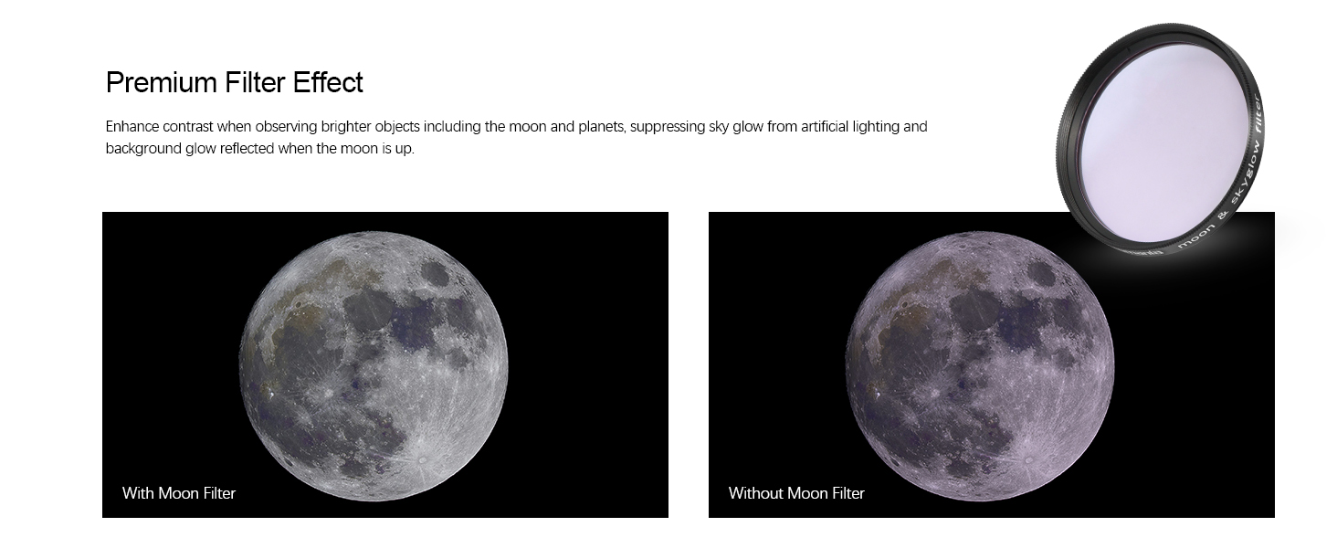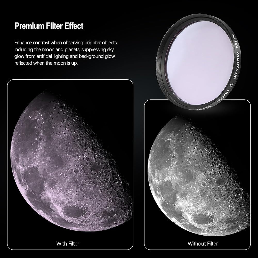 • أكثر من فلتر القمر العادي: يتميز فلتر القمر وSkyglow المتميز بجودة أعلى بكثير من المنتجات المماثلة؛ من العوامل المسببة للاضطراب بشكل خاص أثناء المراقبة إضاءة أضواء الشوارع