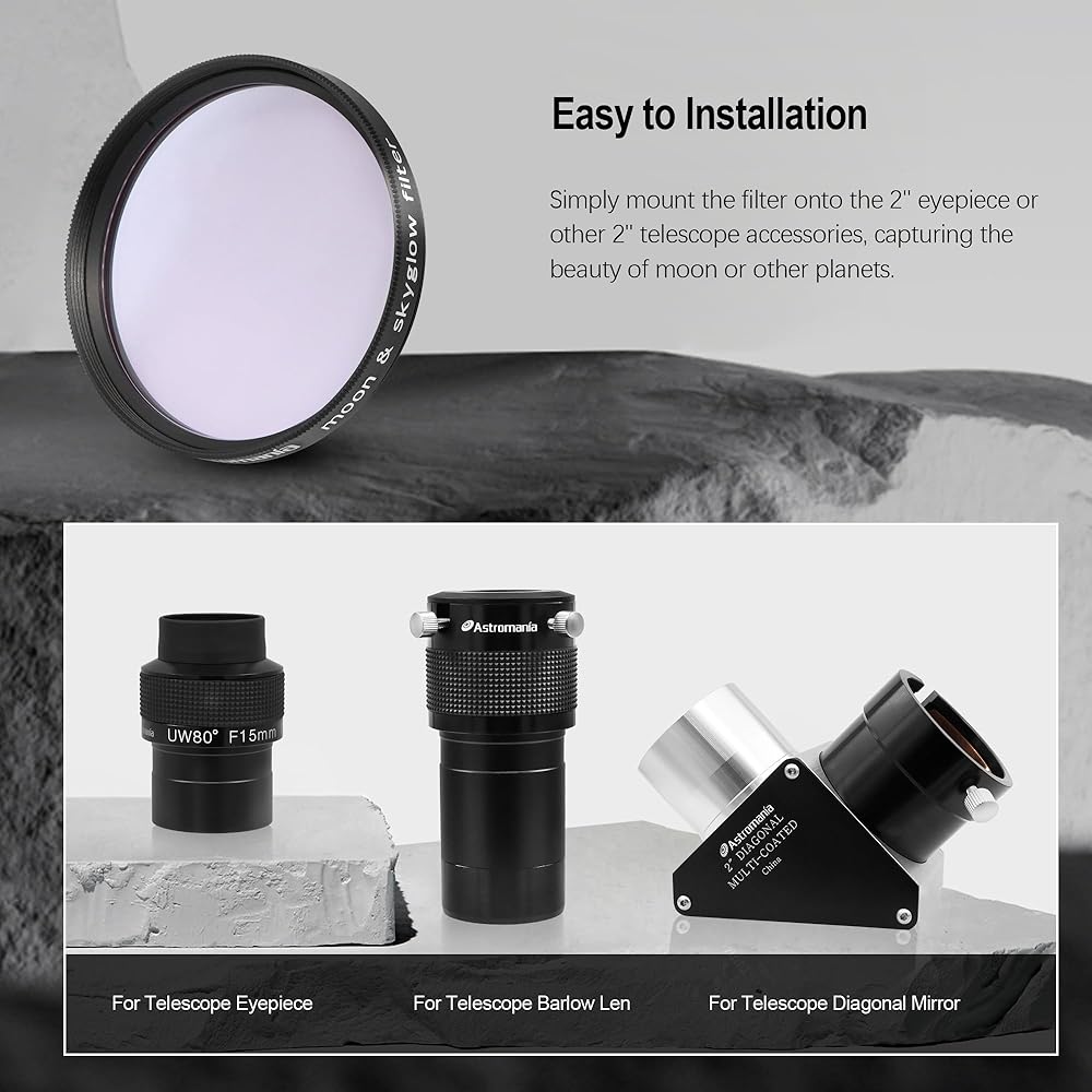 • خيط فلتر قياسي 2 بوصة: يتم تثبيت مرشح القمر وSkyglow مقاس 2 بوصة ببساطة في خيط العدسة؛ أيضًا؛ سيناسب الفلتر جميع العدسات والملحقات ذات الحجم القياسي مقاس 2 بوصة؛ يتم ربطه على كلا الجانبين للتكديس مع مرشحات أخرى إذا لزم الأمر