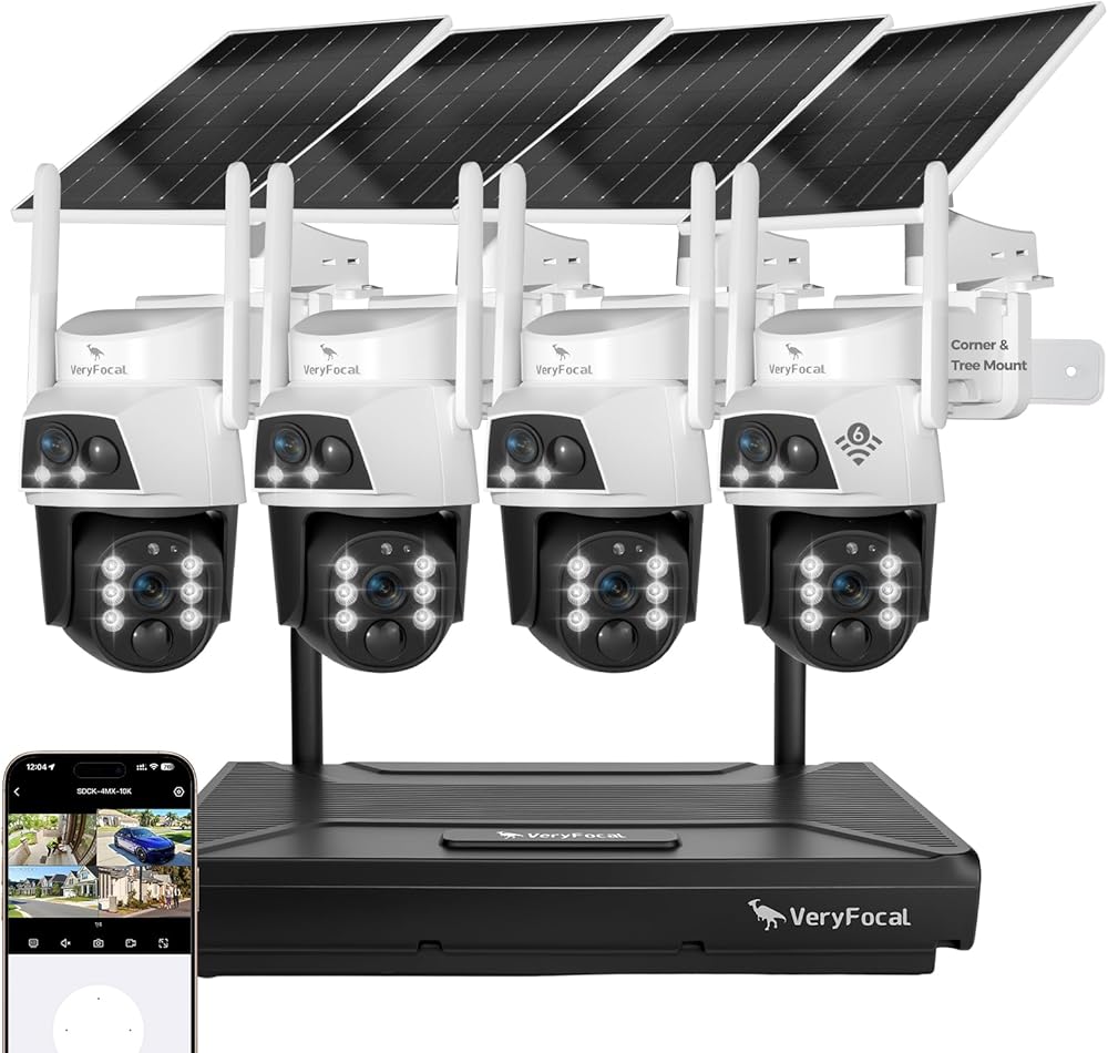 نظام أمان شمسي بأربع كاميرات - عدسة مزدوجة 360 درجة PTZ، 10CH 4K NVR WiFi 6، بطارية 10400 مللي أمبير في الساعة، مقاومة للماء IP66، بدون رسوم شهرية للمنزل الخارجي
