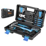 محتويات العلبة - 57 قطعة من الأدوات المنزلية الأكثر وصولًا: مطرقة مخالب، كماشة مفصلية منزلقة، سكين أدوات، مقص، شريط قياس، 4 قطع مفكات براغي دقيقة، 16 قطعة مفاتيح سداسية (بوصة ومتري)، مفك لقمة، عمود تمديد، 30 قطعة لقمة مفك براغي.