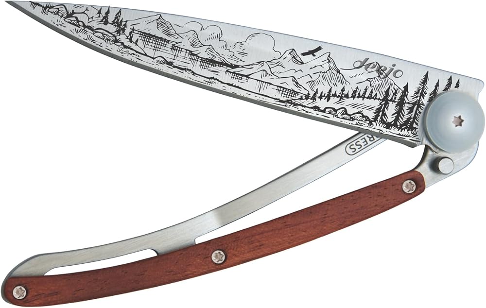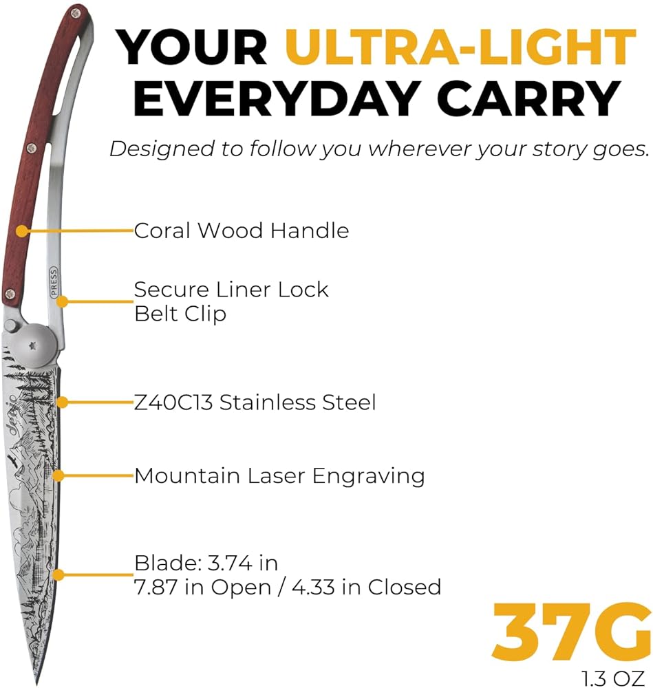 deejo - سكين جيب قابل للطي 37 جرام مع مشبك حزام - تصميم جبلي، شفرة من الفولاذ المقاوم للصدأ مقاس 3.7 بوصة، مقبض من الخشب المرجاني - خفيف الوزن للحمل اليومي للمنزل والعمل والاستخدام الخارجي