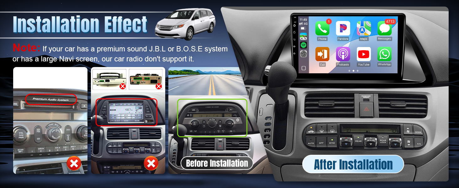 【يرجى ملاحظة】إذا كانت سيارتك تحتوي على نظام J.B.L أو B.O.S.E ممتاز أو تحتوي على شاشة Navi كبيرة، فإن وحدة رأس Android الخاصة بنا لراديو Honda Odyssey لعام 2005 لا تدعمها. إذا لم تكن متأكدًا مما إذا كانت شاشة ستيريو Honda Odyssey 2010 مناسبة لسيارتك، فيرجى إرسال طراز سيارتك وسنتها وصورة لوحة القيادة الخاصة بالسيارة عبر دردشة Amazon، وسنساعدك على التحقق مما إذا كان استريو السيارة Honda Odyssey carplay 05 مناسبًا لسيارتك. نحن نقدم المساعدة عبر الإنترنت وأدلة المستخدم ومقاطع الفيديو الخاصة بالتثبيت.