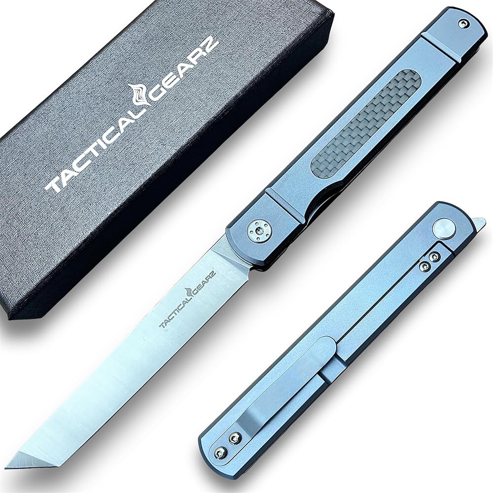 Features Include: Full Tc4 Titanium Handle w/Carbon Fiber! Razor Sharp D2 Steel Tanto Blade! Traditional Japanese Style Thumb Lever, Belt Clip, Custom Gift Box & Sheath!