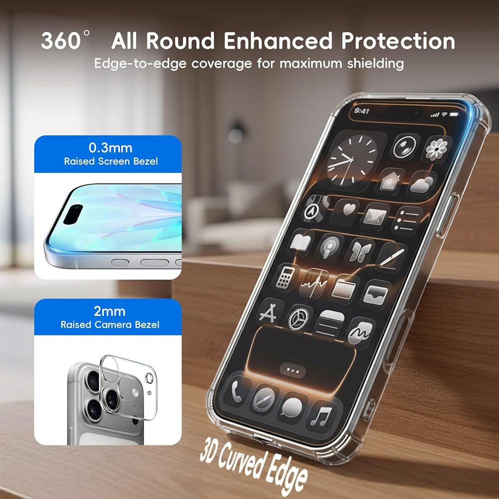 حافظة لهاتف آيفون 17 برو شفافة مع واقي الشاشة وواقي عدسة الكاميرا تغطية كاملة طبقة من الزجاج المقوى صلابة 9H مع صندوق خالٍ من الغبار (عبوة من قطعتين + قطعة واحدة) شفاف