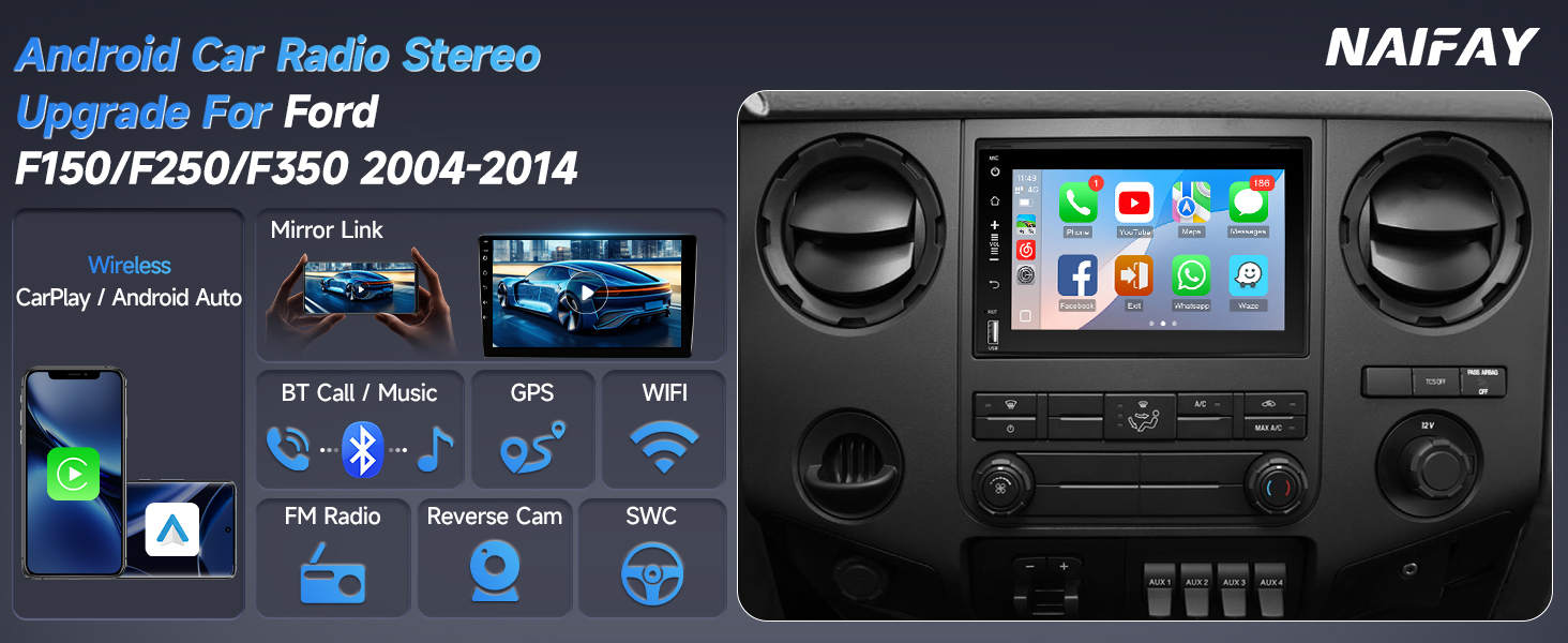 • 【MirrorLink لاسلكي/سلكي وشاشة مقسمة】راديو Naifay لشاشة Ford Expedition Escape لعام 2008 يدعم الاتصال اللاسلكي والسلكي. من خلال توصيل Bluetooth أو كابل USB، يمكنك عرض جميع محتويات التطبيق الخاصة بهاتفك على الشاشة الكبيرة، حتى تتمكن من الاستمتاع بترفيه أفضل عند التوقف والراحة. ويمكن لراديو carpay لعام 2005 F250 F350 القيام بمهام متعددة في نفس الوقت ويدعم وظيفة تقسيم الشاشة لتشغيل أفضل.