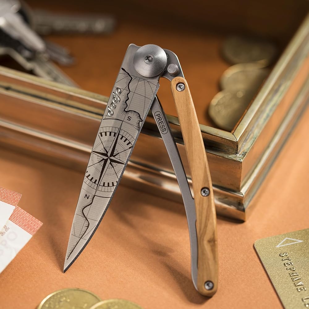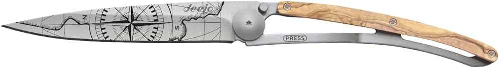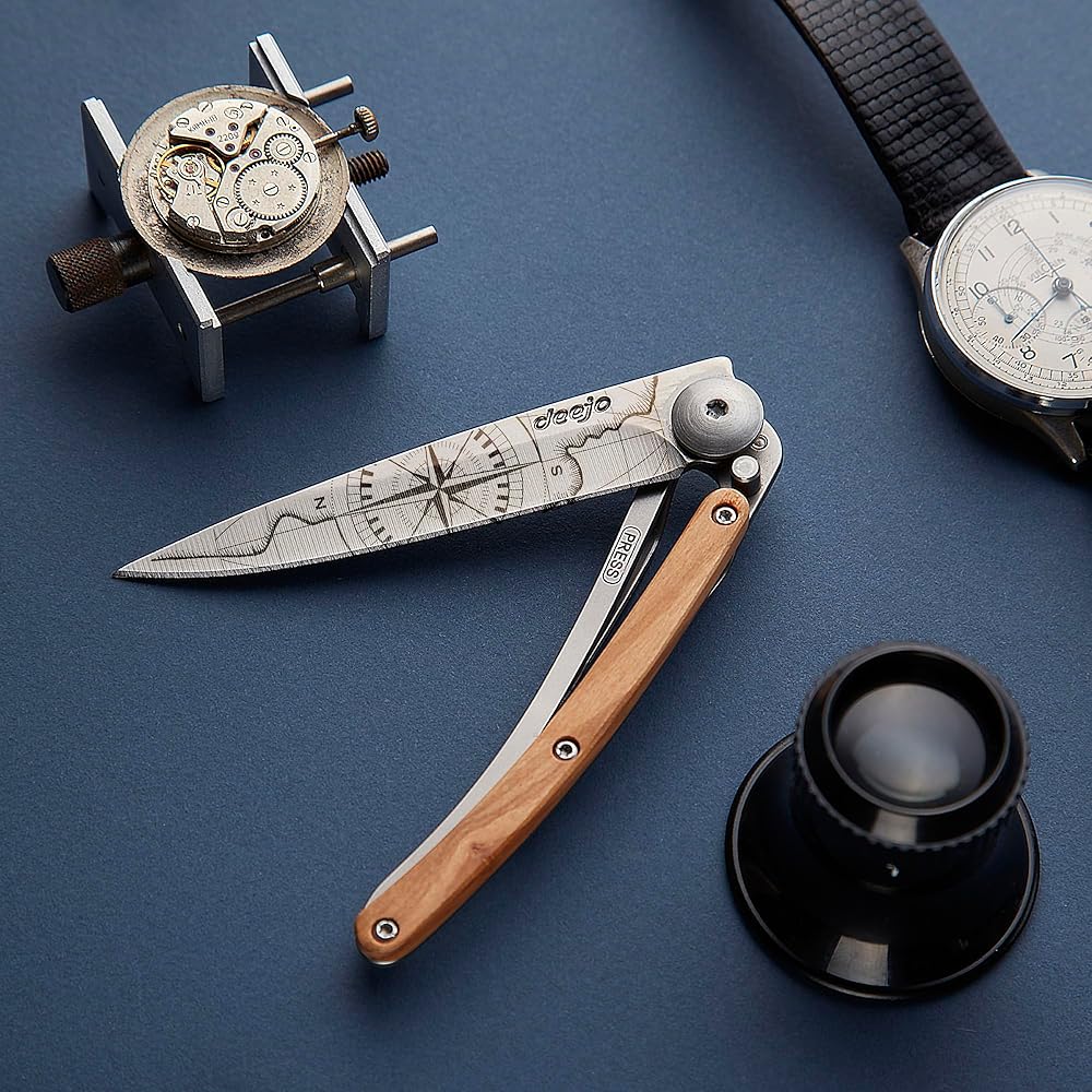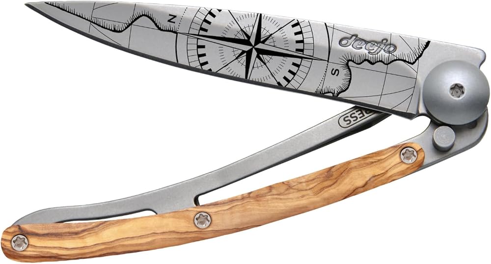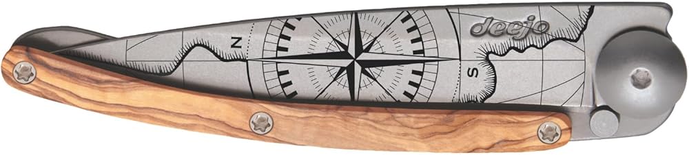 deejo - سكين جيب قابل للطي 27 جرام مع مشبك حزام - تصميم Terra Incognita، شفرة من الفولاذ المقاوم للصدأ مقاس 2.95 بوصة، مقبض من خشب الزيتون - خفيف الوزن للحمل اليومي للمنزل والعمل والاستخدام الخارجي