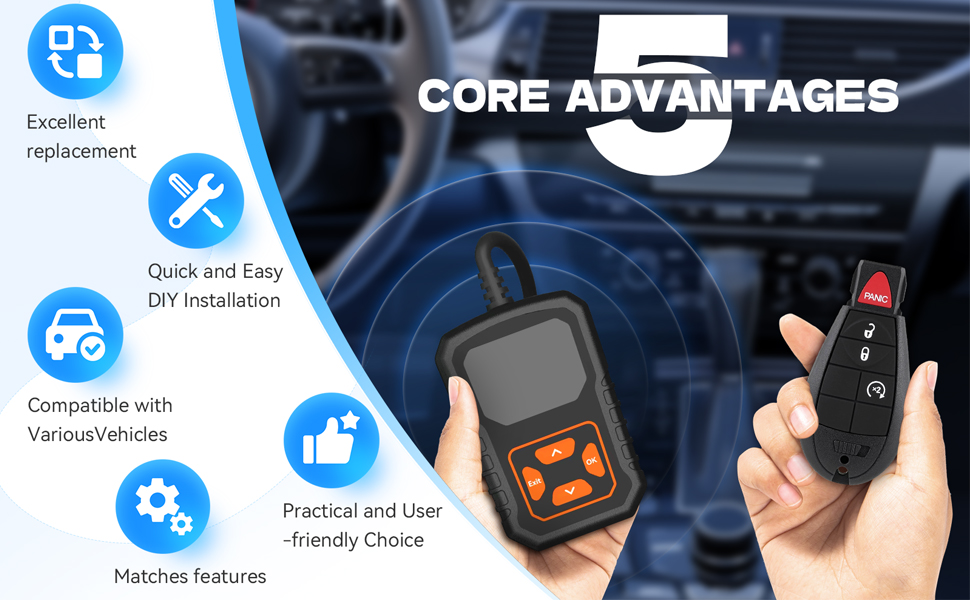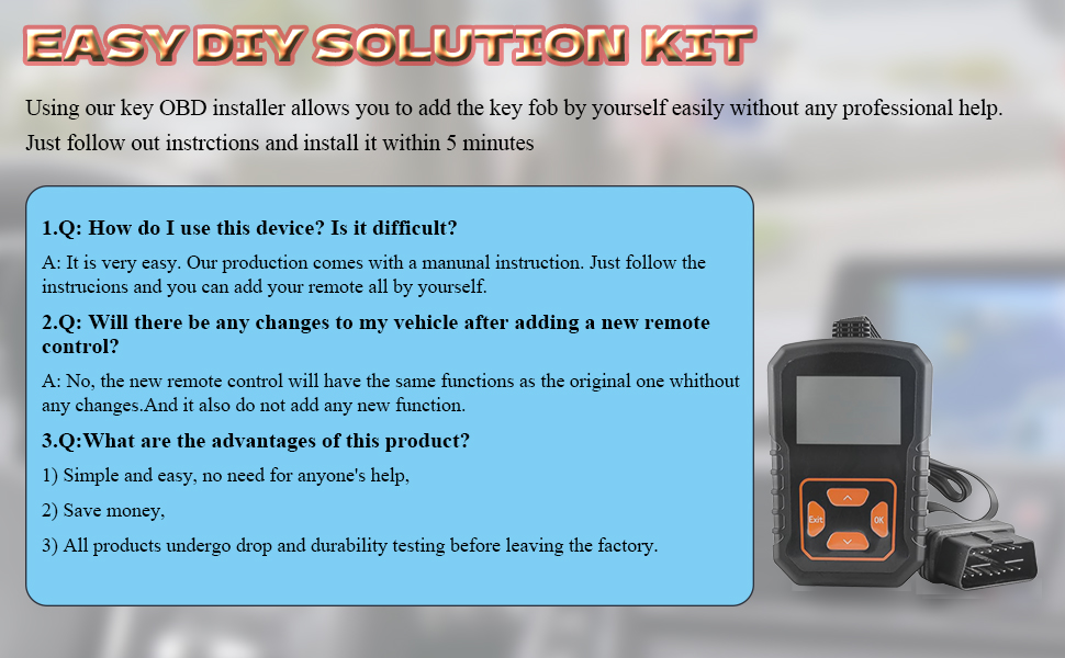 • أداة obd مع الشاشة: قم بالتوصيل بمنفذ obd2، لا حاجة إلى هاتف محمول، لا حاجة إلى تنزيل التطبيق، اتبع المطالبات التي تظهر على الشاشة، واضحة في لمحة، استبدل جهاز التحكم عن بعد بدون مفتاح الذي تم ارتداؤه أو المكسور بسرعة وسهولة.