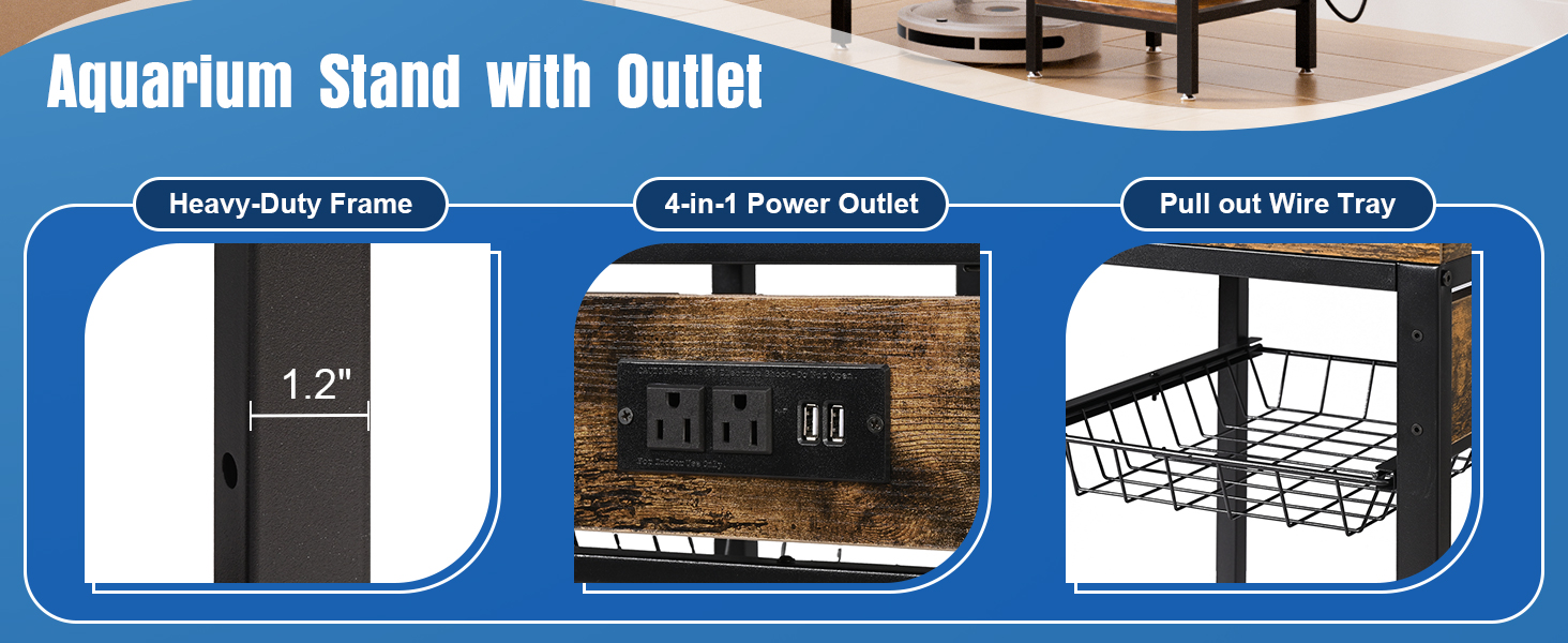 منفذ طاقة مدمج 4 في 1: مزود بمحطة طاقة متكاملة (2 منافذ تيار متردد + 2 منافذ USB)، يتيح لك هذا الحامل توصيل المرشحات والسخانات وأضواء الخزان والأجهزة الأخرى بسهولة في مكان واحد - لا حاجة إلى أسلاك فوضوية أو أسلاك تمديد إضافية. يمكن تركيب محطة الطاقة على الجانب الأيسر أو الأيمن، لتتكيف بشكل مثالي مع تخطيط المساحة الخاصة بك.