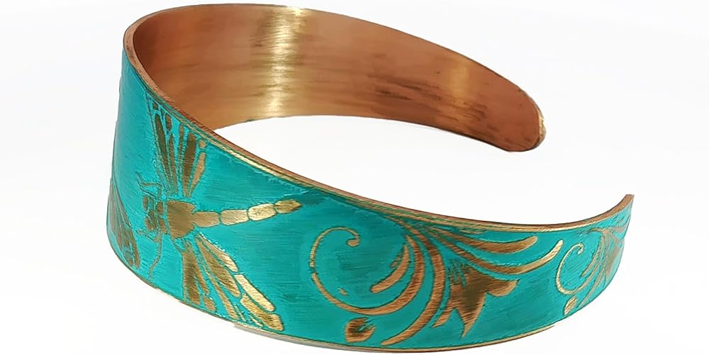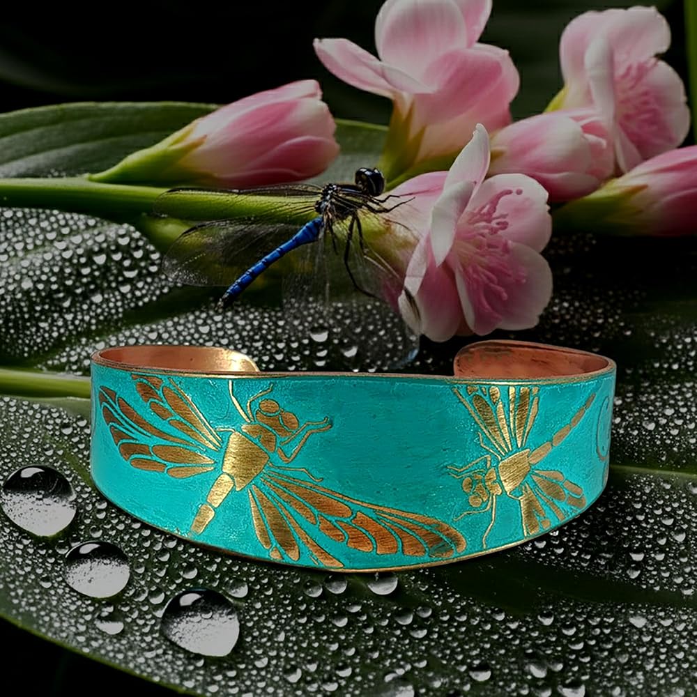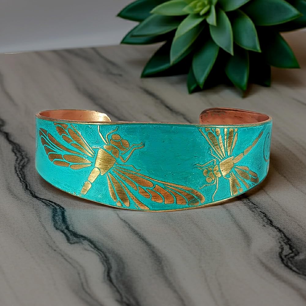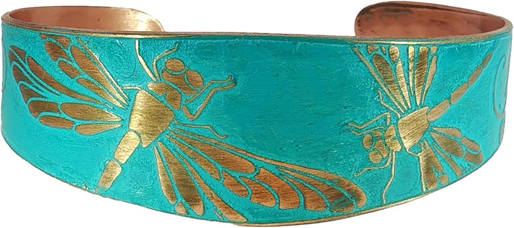 سوار مصنوع يدويًا من النحاس الصلب مدبب مع عزر اليعسوب المحفور، زنجار ريفي