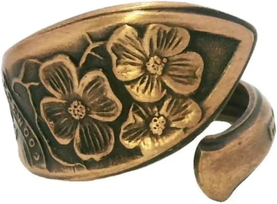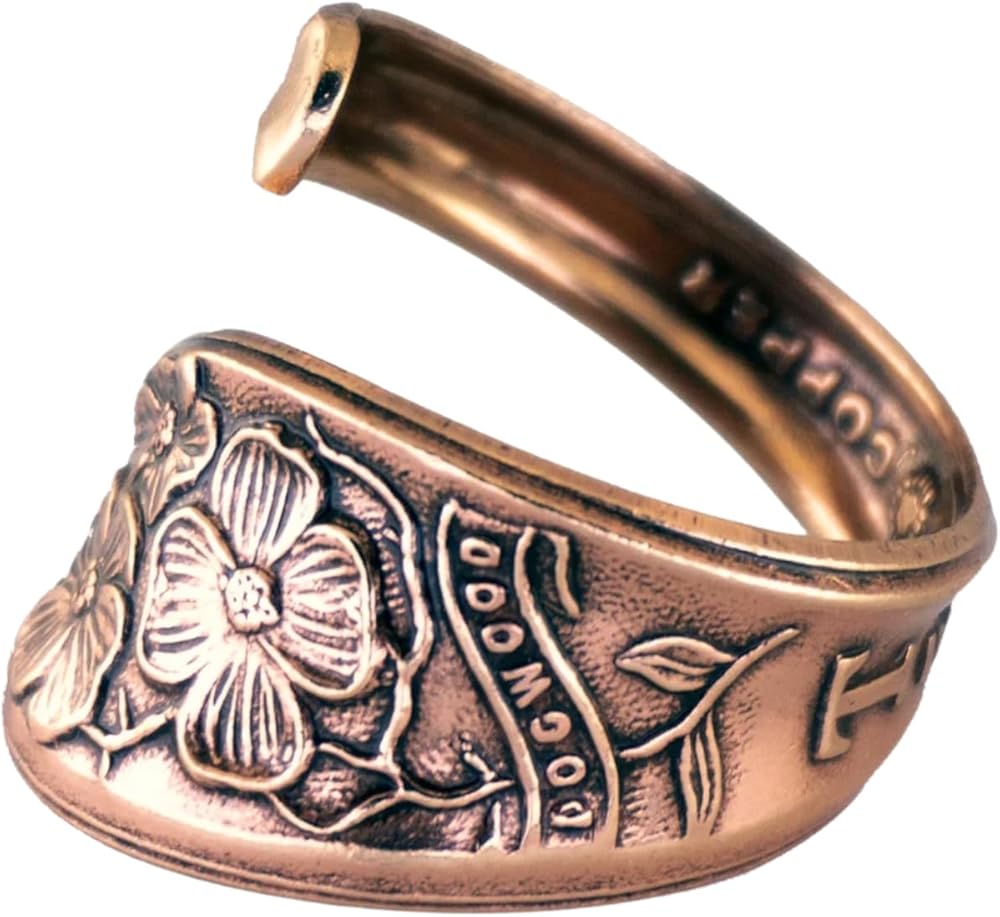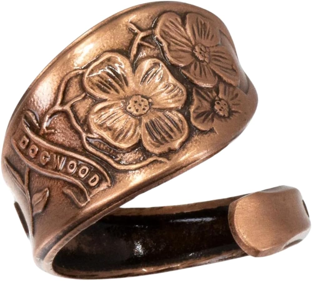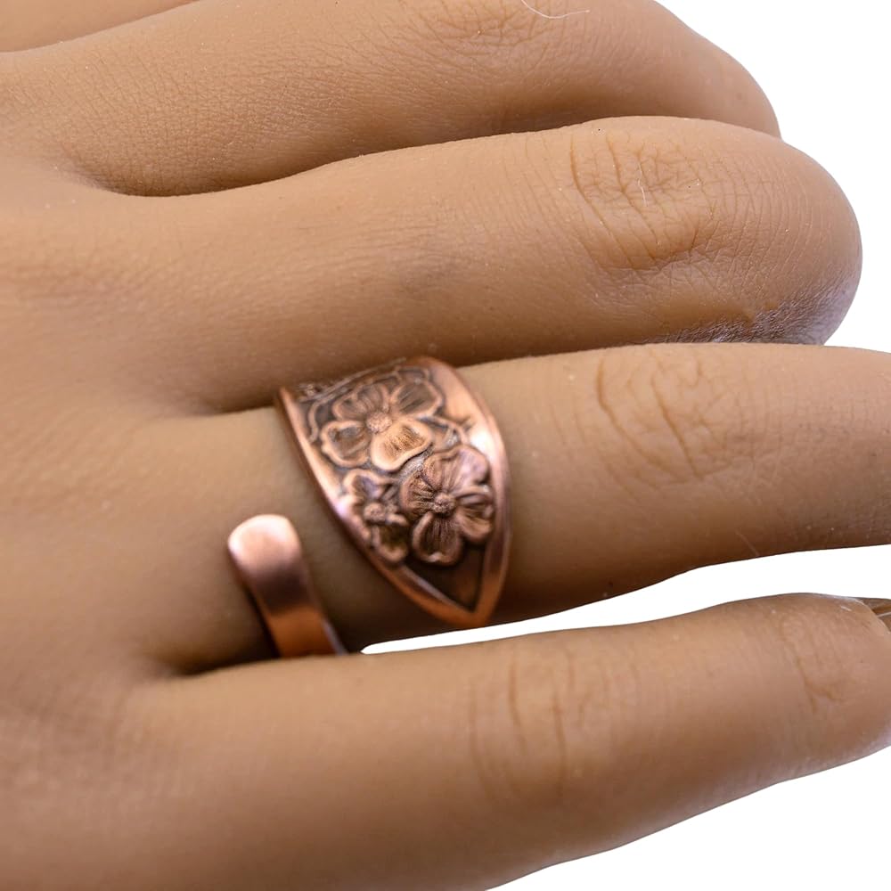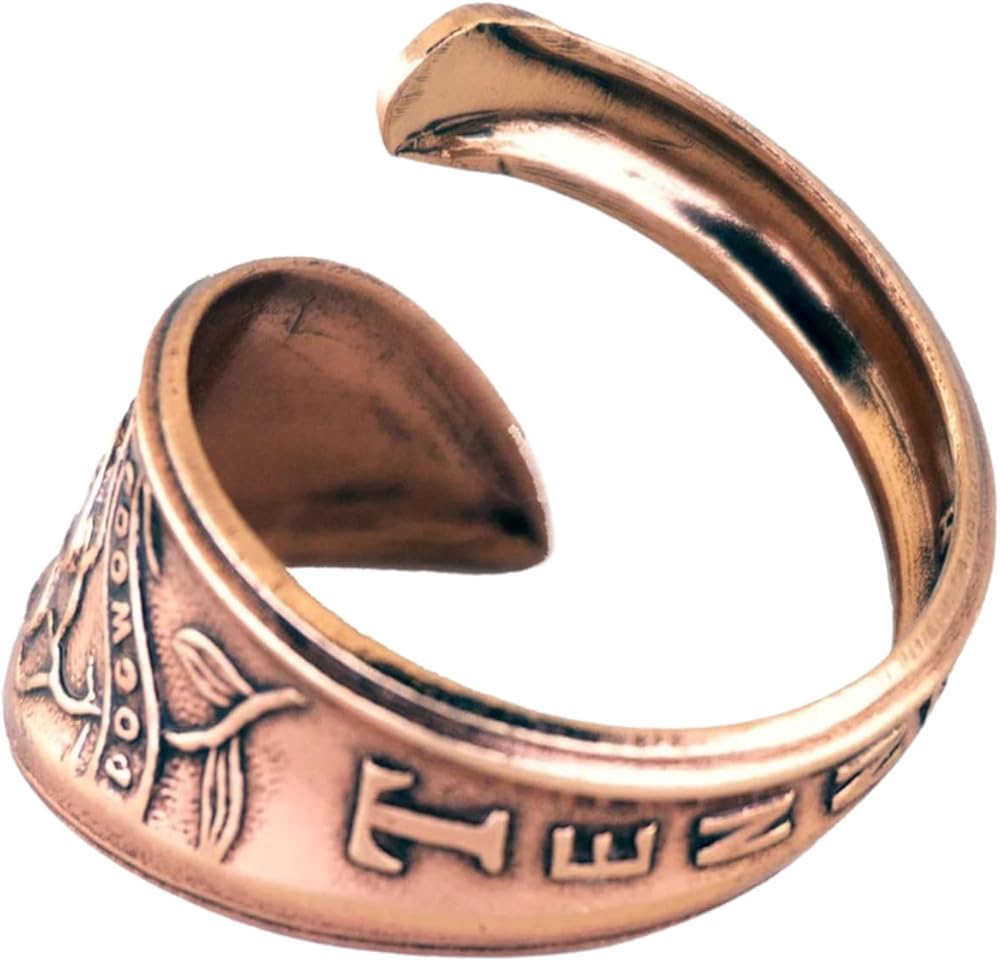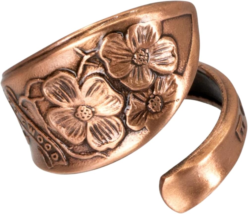 A real spoon handle was used to create this stylish solid copper adjustable ring. Rings are hand antiqued and have a baked lacquer coating for long lasting look and durability.