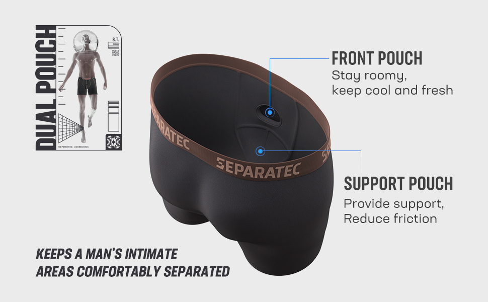 • تقنية الحقيبة المنفصلة الحاصلة على براءة اختراع: الملابس الداخلية المبتكرة ذات الحقيبة المزدوجة للرجال تحافظ على المناطق الحميمة للرجل منفصلة بشكل مريح، مما يوفر الدعم الكافي وتدفق الهواء اللازم. لا قيود، لا تعديل بالحرج