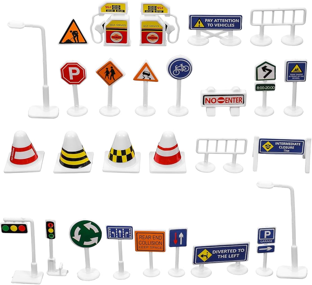 28 قطعة من زينة إشارات المرور المصغرة، زينة لافتات الطرق البلاستيكية الصغيرة، زينة لبيت الدمى، مخروط المرور، حاجز إشارة، نموذج إشارات الشوارع الصغيرة، مجموعة تعليمية لبيت الدمى، منظر صغير