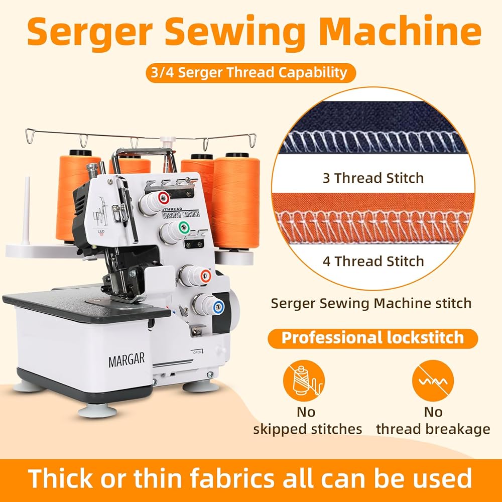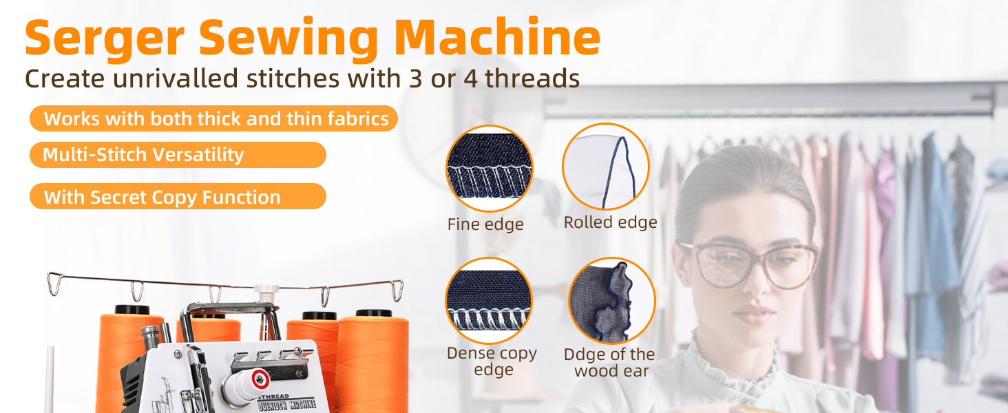 3/4 خيط: تحقق ماكينة الاوفرلوك زيادة في التشابك لـ 3 خيوط و4 خيوط عن طريق استخدام التقاط خيط شريط الإبرة، أو إبر مستقيمة مزدوجة أو إبر منحنية مزدوجة لحلقات الخيط، وتشذيب الحواف تلقائيًا. يمكن تعديل ماكينة الخياطة Serger لإجراء خياطة حاشية ملفوفة ثلاثية الخيوط وإغلاق محكم وفقًا لمتطلبات إنتاج الخياطة