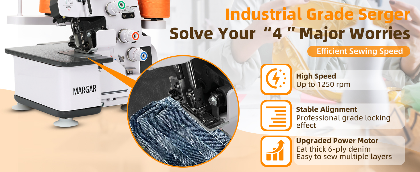 قوية ومتينة: تعتمد ماكينة الخياطة serger جسمًا معدنيًا عالي القوة وأجزاء عالية الجودة لضمان استمرار تشغيل المعدات بثبات بسرعات عالية والتكيف مع احتياجات الإنتاج طويلة الأمد وعالية الكثافة. يوصى باستخدام خيط الخياطة عالي الجودة لتحسين جودة الخياطة، وتقليل المشكلات مثل كسر الخيط وتخطيه، وإطالة عمر خدمة ماكينة الخياطة الأوفرلوك