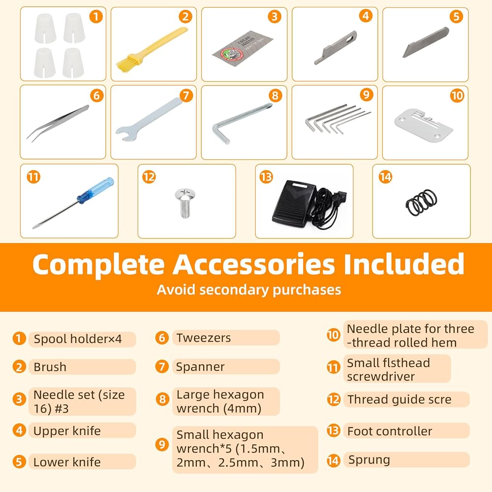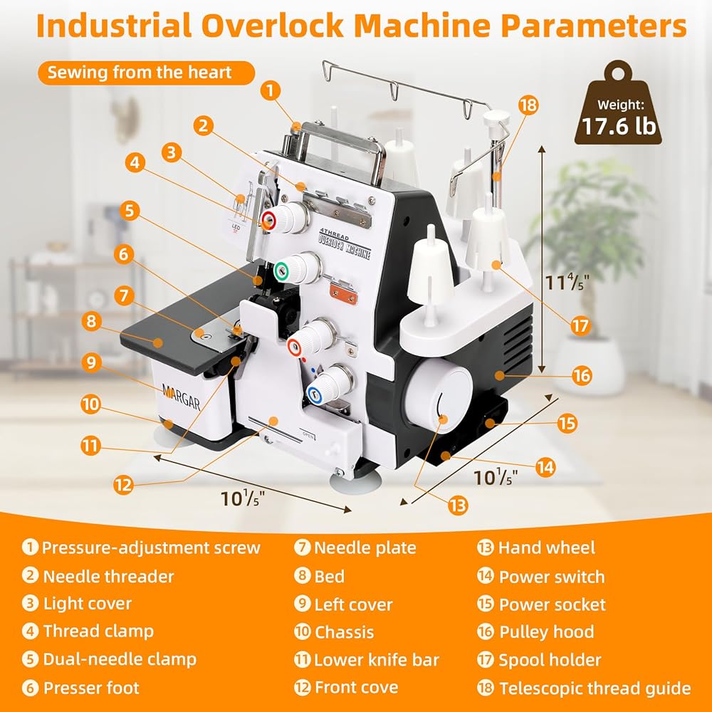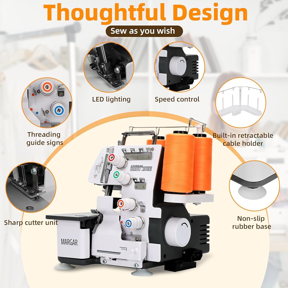 التكوين الاحترافي: تتيح الإرشادات الواضحة المرمزة بالألوان داخل ماكينة الاوفرلوك التعرف السريع على مسارات الخيوط المختلفة، مما يبسط عملية الخيوط. قاعدة مطاطية مضادة للاهتزاز وتصميم هيكل داخلي دقيق يمكّن ماكينة الخياطة serger من تحقيق عملية اهتزاز منخفضة. يمكن تشغيل إضاءة LED في بيئات الإضاءة المنخفضة لتقليل التعب البصري وتحسين دقة عمل ماكينة الأوفرلوك