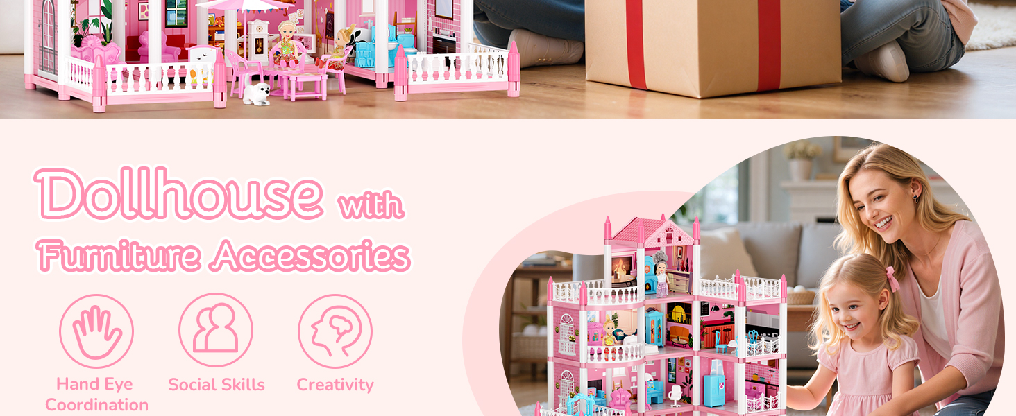 • لعب الأدوار: بيت الدمى الذي يشجع على إنشاء بيت دمى للأطفال. غرف إبداعية ذات مساحة مفتوحة للتزيين، بما في ذلك حمام عائلي وغرفة جلوس وغرفة بطابع الأميرة وغرفة طعام. الدمى الواقعية تضيف لمسة من الواقع وتشجع الأطفال على لعب الأدوار.