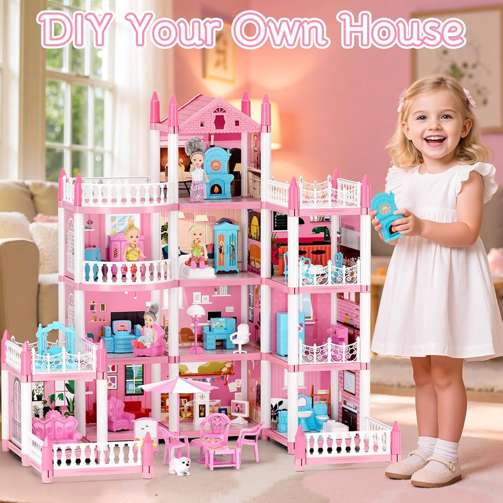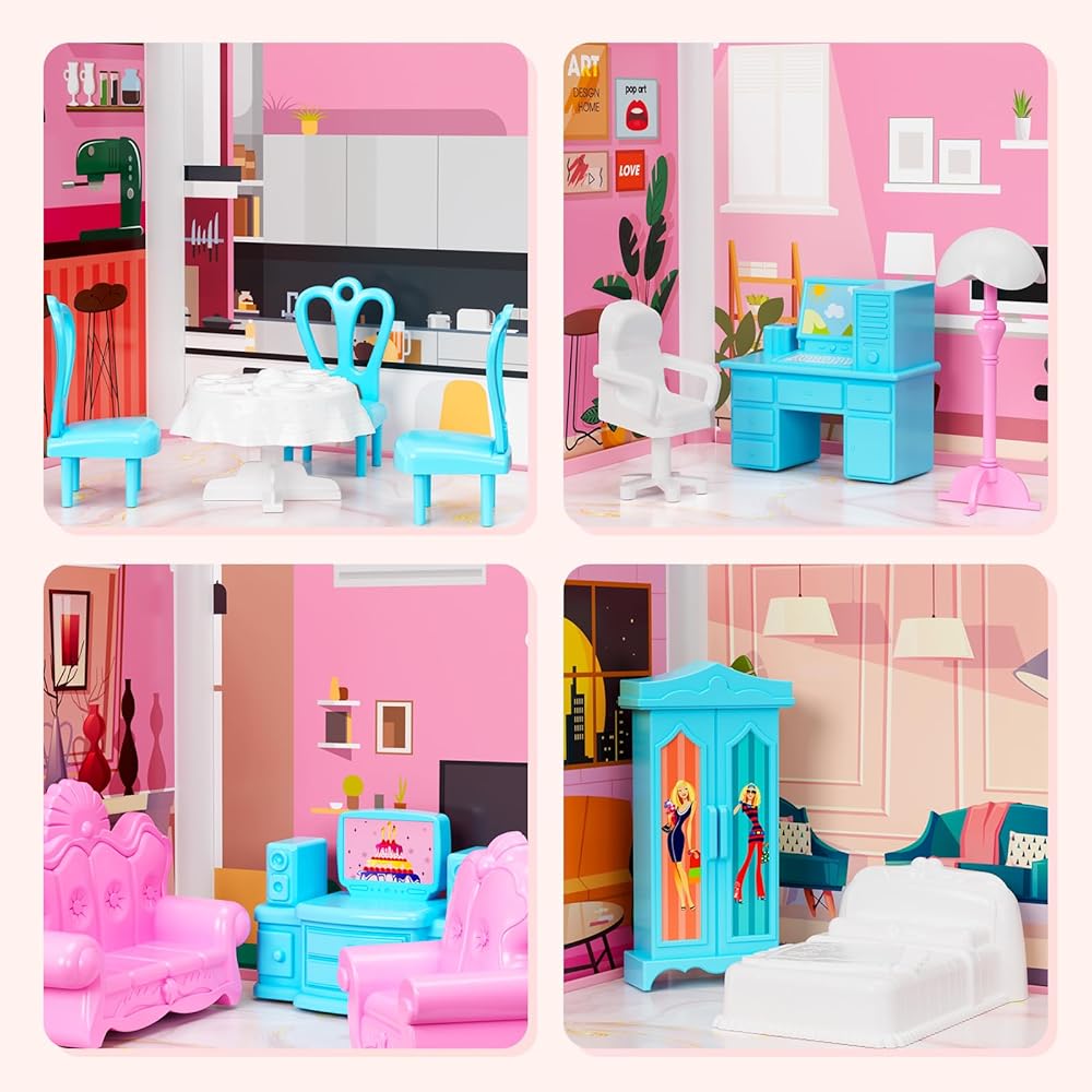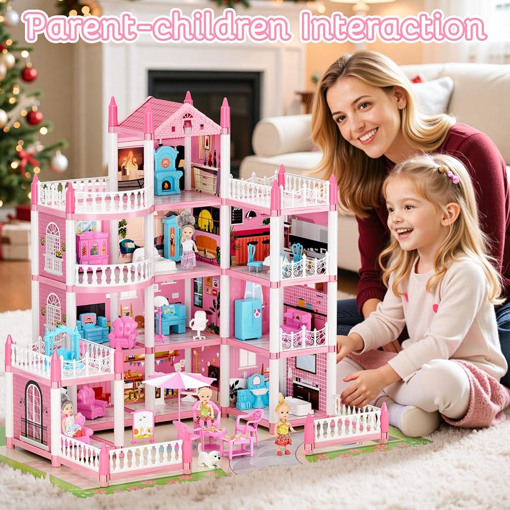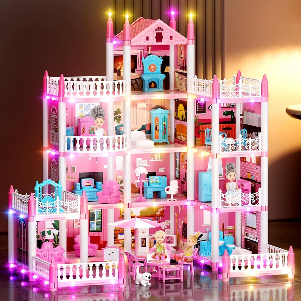 بيت الدمى المكون من 4 قصص للفتيات، بيت لعب من إكسسوارات بيت الدمى مع الأثاث و11 غرفة، بيت اللعب التظاهري مع أضواء للأطفال، مجموعة ألعاب بناء الدمى المحمولة هدية للأعمار من 6 سنوات فما فوق