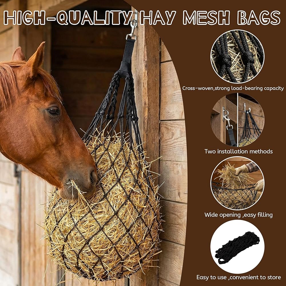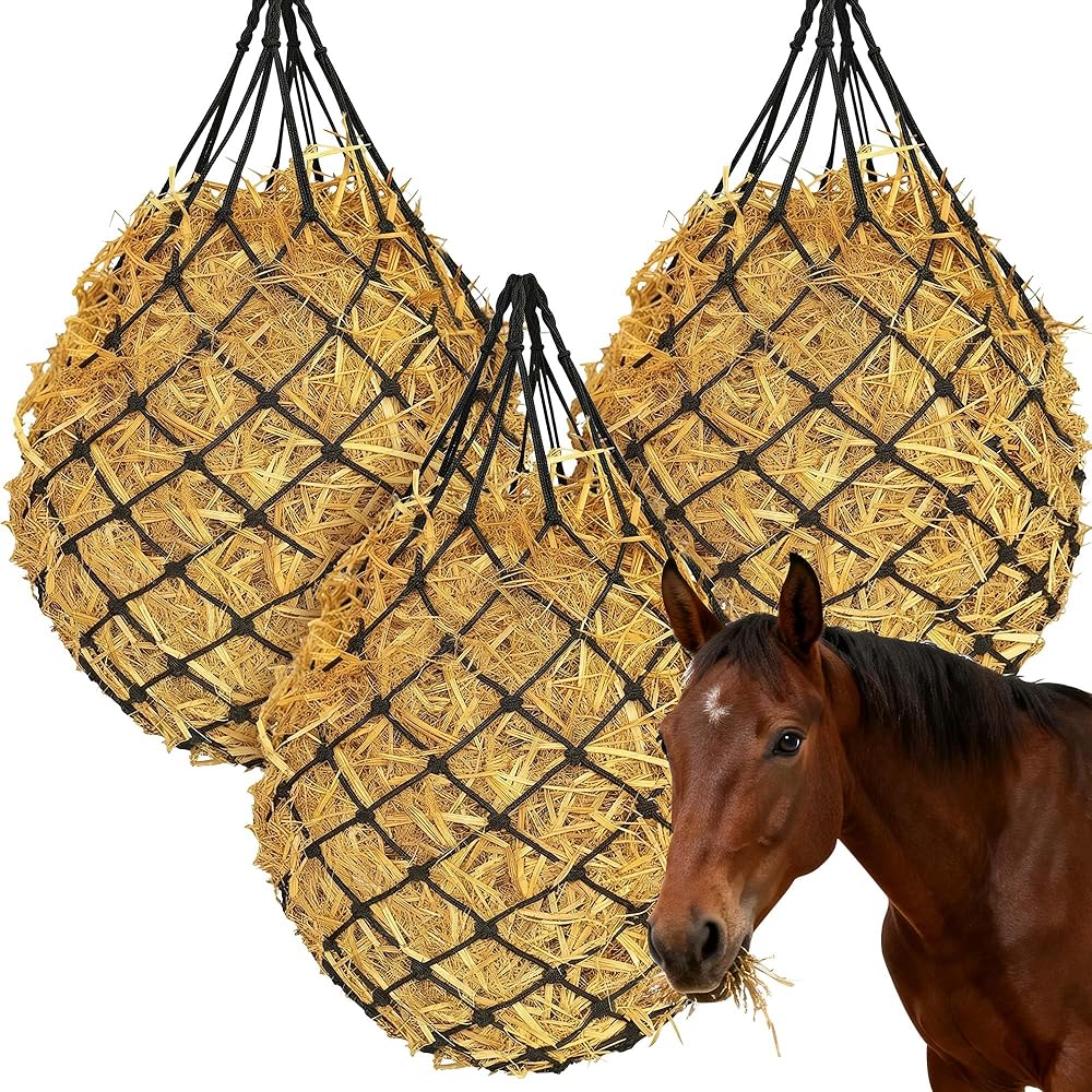 Provide your horses with a safer, cleaner, and more natural way to graze with our heavy-duty slow-feed hay bag, an organized way to feed horses, goats, and sheep in barns or stables. The 2.75" slow-feed mesh encourages natural, steady eating to support better digestion and reduce hay waste. Built from heavy-duty, reinforced material, it withstands chewing, pulling, and daily barn use. With dual mounting options, it installs quickly on stalls, fences, gates, or trailers. The convenient 3-pack design allows rotation and multiple feeding points, making it a practical solution for busy farms and long-term feeding routines.
