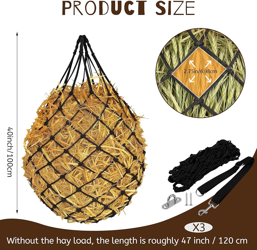 3 قطع من أكياس القش شديدة التحمل للتغذية البطيئة للخيول - شبكة تغذية شبكية كبيرة معلقة مقاس 47 بوصة للخيول والماعز والأغنام، مع أشرطة وخطافات للأكشاك والسياج والمقطورة