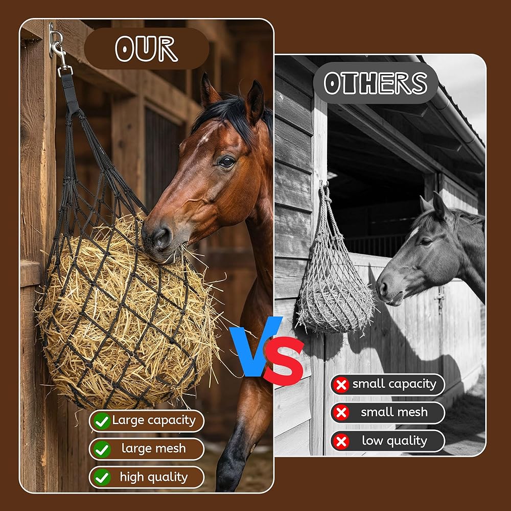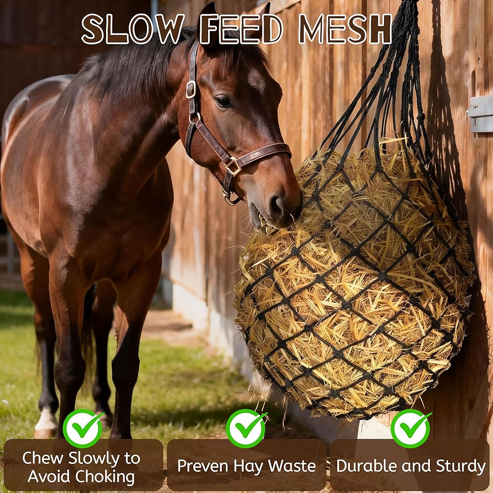 Slow-Feed Mesh: The 2.75 × 2.75 inch grid acts as hay nets for horses slow feed, helping horses eat at a natural pace while reducing bloating, choking risk, and hay waste. It works as a slow feeder hay net for horses in barns and boarding stables