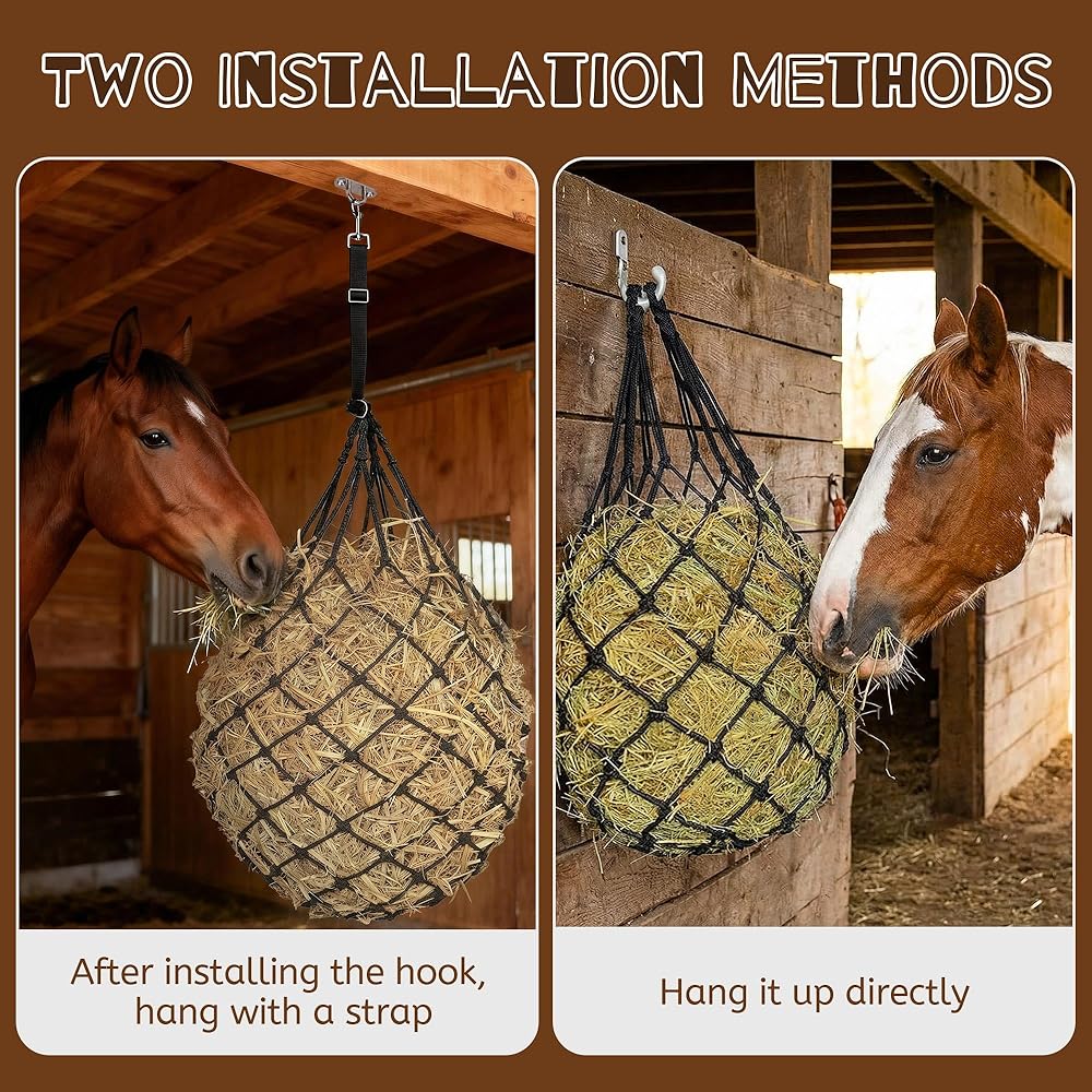 Dual Mounting Options: Quickly install as a hanging hay net or a secure mounted feeder using the included straps and hardware. Fits stalls, fences, trailers, and riding arenas—suitable for various settings for hay nets for horse users