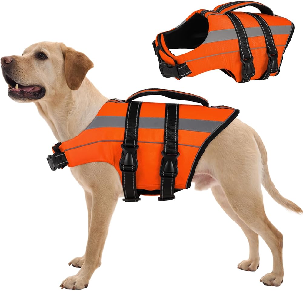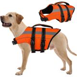 This dog life jacket is designed to provide flotation support and everyday comfort for dogs during water activities. FUAMEY dog life vest helps keep dogs balanced and visible while swimming. The dog flotation vest features reflective strips to improve visibility in low-light conditions, along with a sturdy top rescue handle for quick control when needed. A built-in D-ring allows you to attach a leash easily, making transitions between land and water more convenient. With adjustable straps and a secure fastening system, this dog swim vest offers a stable and customized fit. The quick-release buckle makes it easy to put on and remove, while helping the vest stay in place during active movement. Suitable for swimming, pool time, beach outings, boating, kayaking, and paddleboarding, this dog swimming vest is a reliable choice for common water activities and everyday water use.