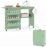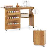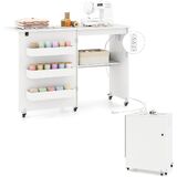 Take your crafting to the next level with this versatile folding sewing desk! The built-in charging station on side provides flexible power source while maintaining a tidy tabletop. In addition to the ample workspace, you will discover a handy storage shelf and 3 bins below, perfect for organizing threads, needles, and scissors. For added convenience, 5 smooth rolling wheels allow you to relocate your sewing station effortlessly and securely lock it in place. When not in use, the craft station table conveniently folds away to save space. Whether used for your home, studio, or any small space, this versatile sewing table combines convenience and efficiency.