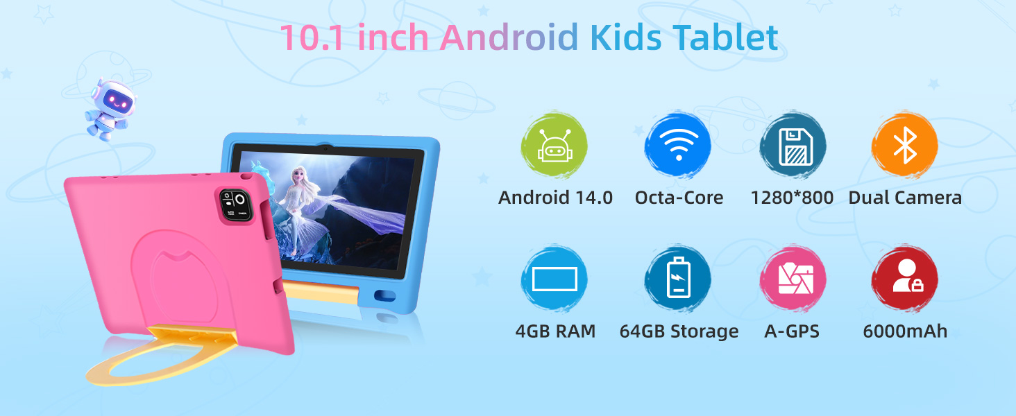 تابلت للأطفال، شاشة لمس IPS HD مقاس 10.1 بوصة تعمل بنظام Android 14 ومساحة تخزين 64 جيجابايت، وذاكرة الوصول العشوائي (RAM) سعة 8 جيجابايت (4+4 افتراضية)، وجهاز لوحي ثماني النواة للأطفال مع حافظة مقاومة للأطفال، وأدوات تحكم أبوية، وبطارية 12 ساعة، وواي فاي