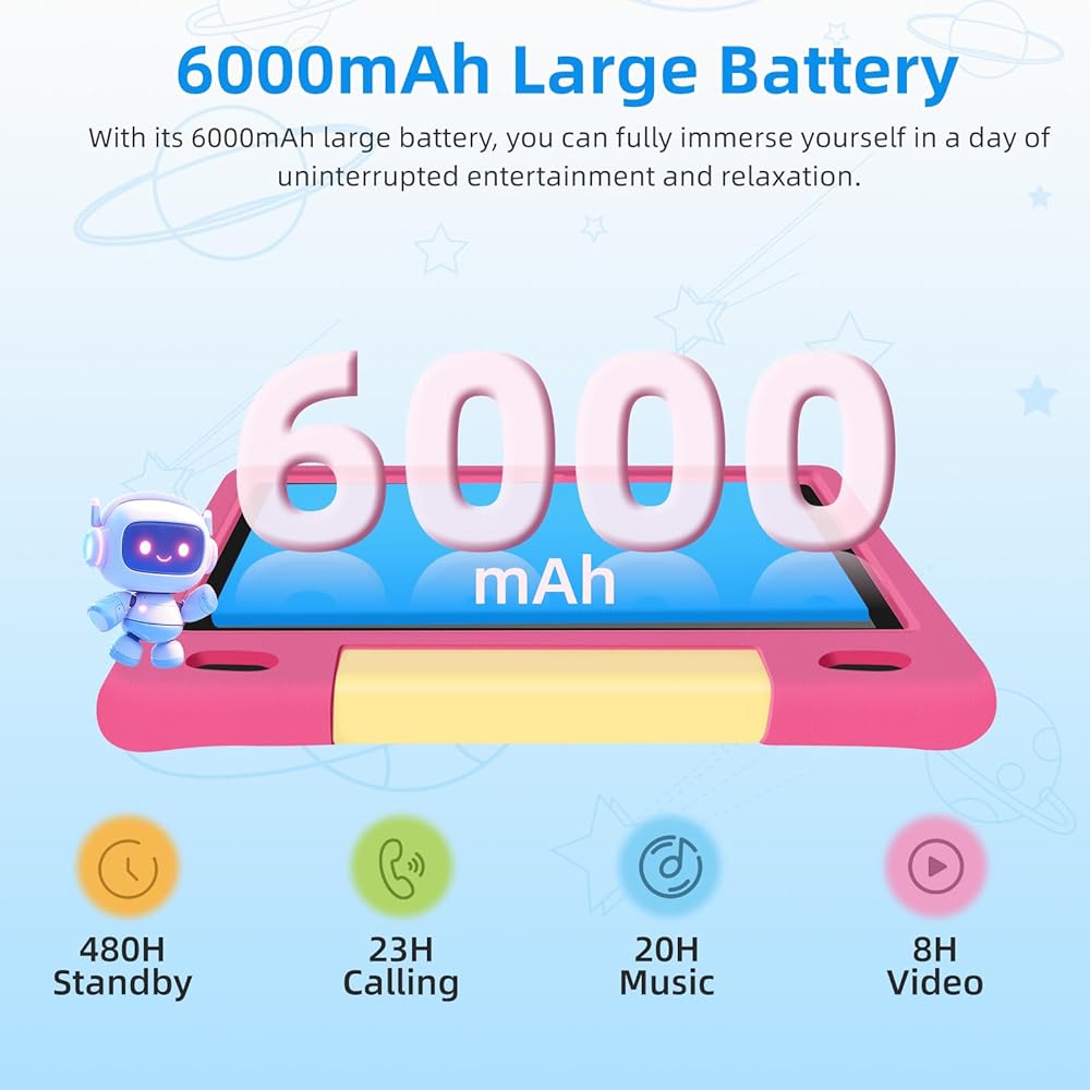 • بطارية طويلة الأمد وتصميم آمن على الأطفال: يتميز هذا الجهاز اللوحي للأطفال ببطارية عالية السعة 6000 مللي أمبير في الساعة، ويوفر ما يصل إلى 12 ساعة من الاستخدام المستمر بشحنة واحدة، مما يجعله مثاليًا للرحلات الطويلة أو الرحلات الجوية أو التعلم طوال اليوم. مغلف بحافظة واقية متينة ومقاومة للصدمات من مادة إي في إيه، ومع ضمان استبدال لمدة عامين، فهو مصمم من أجل المتانة والتعامل بدون قلق، مما يجعله آمنًا للأطفال النشيطين الذين تتراوح أعمارهم بين 3 و12 عامًا.