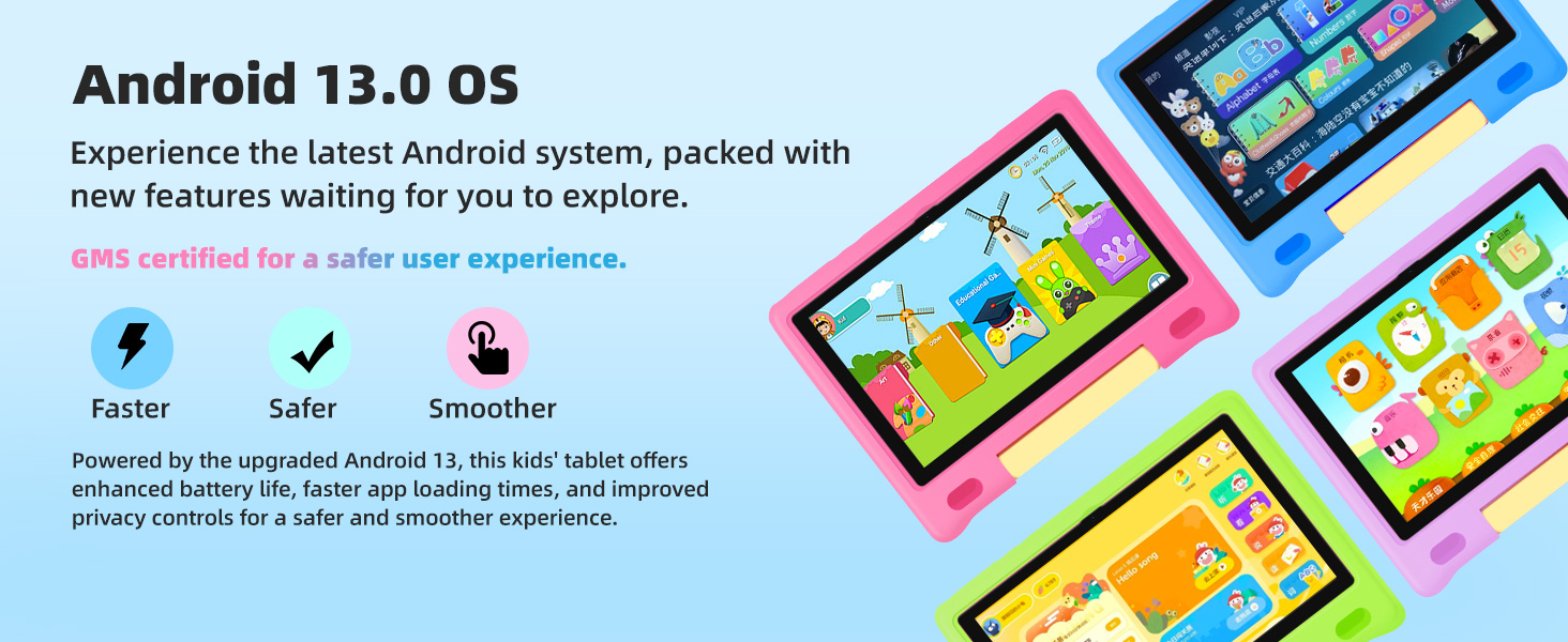 أحدث نظام تشغيل Android 14 مع ذاكرة وصول عشوائي 8 جيجابايت (4+4 جيجابايت افتراضية) للسرعة: مدعوم بأحدث نظام تشغيل Android 14 ومعالج ثماني النواة بسرعة 1.8 جيجا هرتز، يضمن هذا الجهاز اللوحي للأطفال أداءً سريعًا وخاليًا من التأخر، ومثاليًا للتطبيقات التفاعلية والألعاب التعليمية والبث. مزود بذاكرة وصول عشوائي (RAM) سعة 8 جيجابايت (4+4 جيجابايت افتراضية) وتوافق مع WiFi 6، ويعمل بشكل أسرع بنسبة تصل إلى 40% من الأجهزة اللوحية التي تعمل بنظام Android 13، مما يوفر للأطفال تجربة سلسة وجذابة مع Google Kids Space وYouTube Kids وغيرها من المنصات الموثوقة.