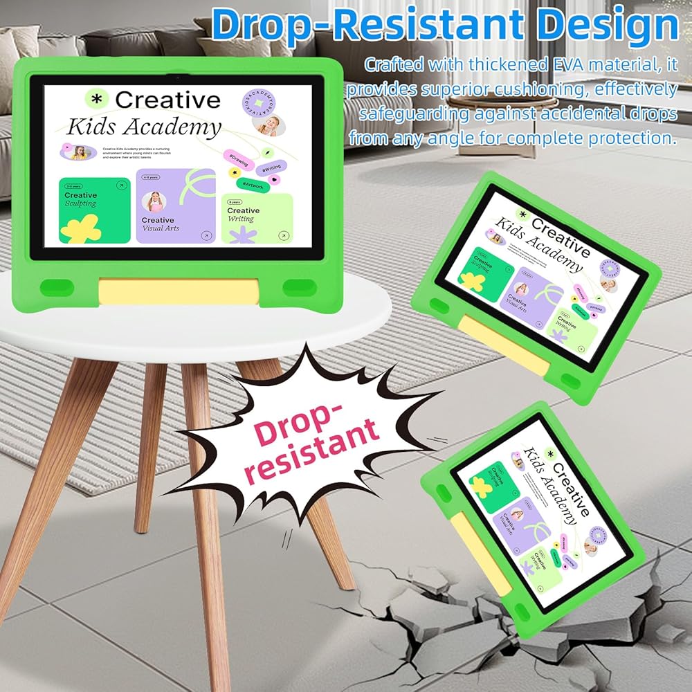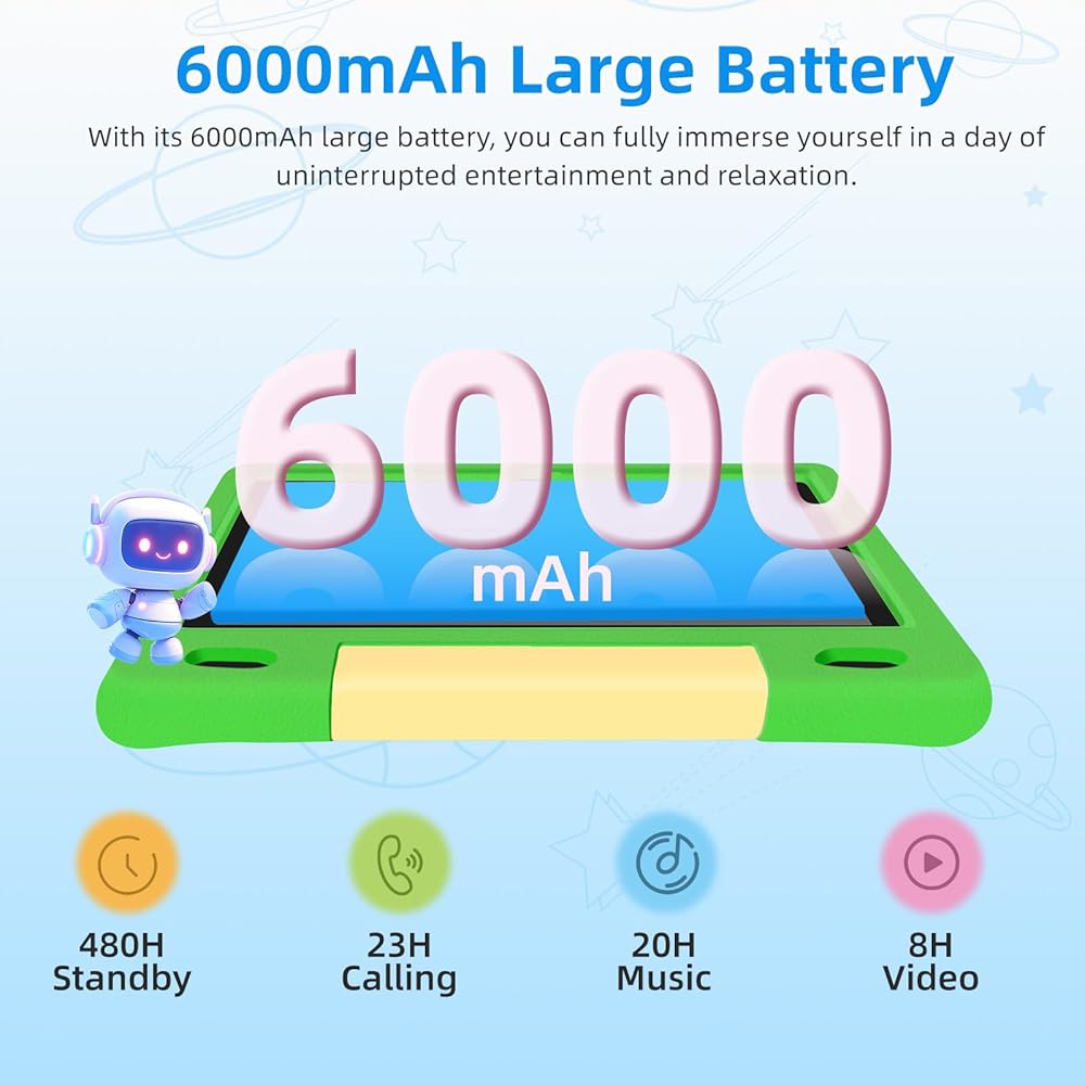 بطارية طويلة الأمد وتصميم آمن على الأطفال: يتميز هذا الجهاز اللوحي للأطفال ببطارية عالية السعة 6000 مللي أمبير في الساعة، ويوفر ما يصل إلى 12 ساعة من الاستخدام المستمر بشحنة واحدة، مما يجعله مثاليًا للرحلات الطويلة أو الرحلات الجوية أو التعلم طوال اليوم. مغلف بحافظة واقية متينة ومقاومة للصدمات من مادة إي في إيه، ومع ضمان استبدال لمدة عامين، فهو مصمم من أجل المتانة والتعامل بدون قلق، مما يجعله آمنًا للأطفال النشيطين الذين تتراوح أعمارهم بين 3 و12 عامًا.