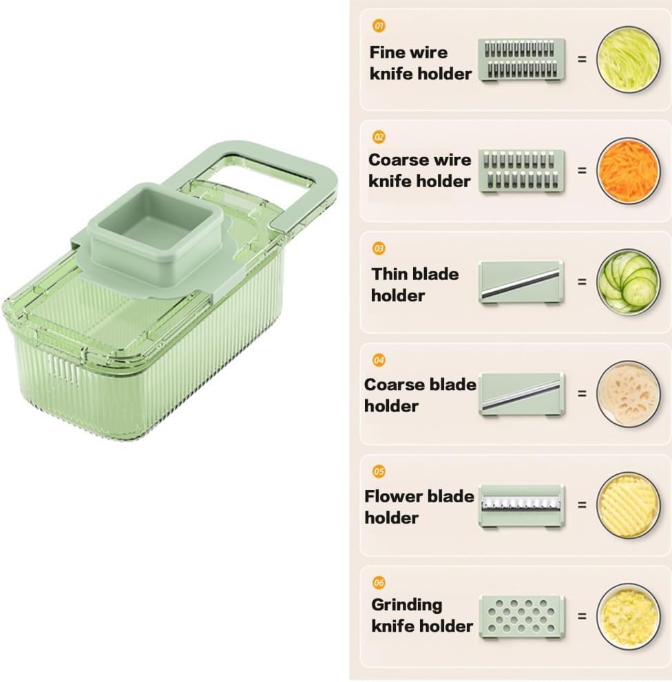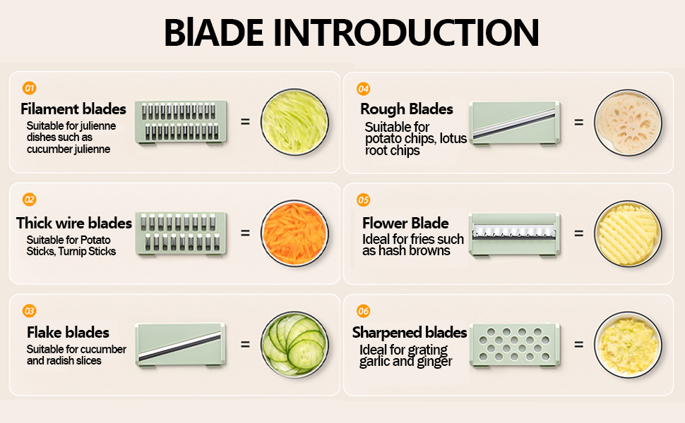 6 شفرات قابلة للتبديل: تشتمل قطاعة المطبخ متعددة الاستخدامات هذه على قطاعة دقيقة وستة شفرات من الفولاذ المقاوم للصدأ، مما يوفر خيارات متعددة لإعداد الطعام للفواكه والخضروات. قم بالتقطيع والبشر والتقطيع بسهولة دون الحاجة إلى سكاكين أو ألواح تقطيع إضافية.