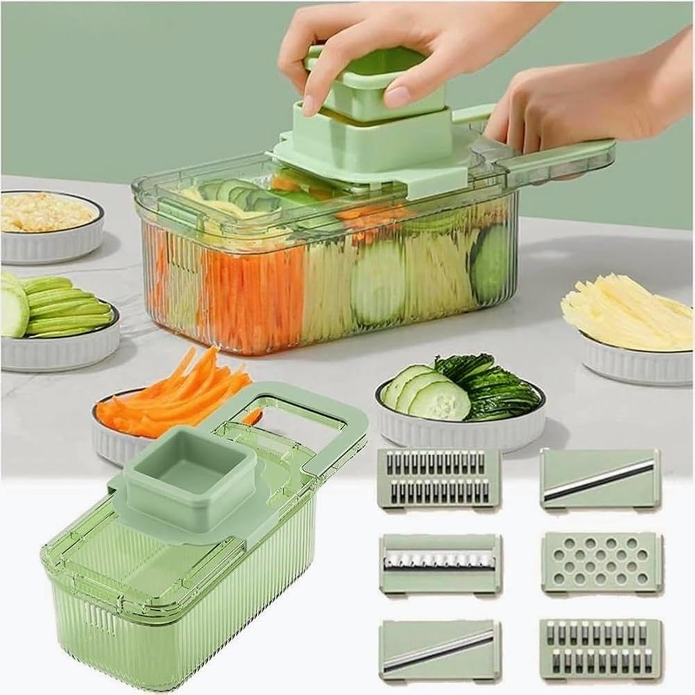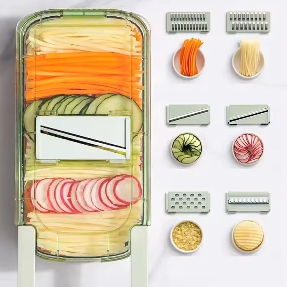 مبشرة ومفرمة متعددة الوظائف: تعامل بسهولة مع مجموعة متنوعة من مهام المطبخ باستخدام هذه المبشرة ومروحية الخضروات الكل في واحد. إن أدوات التقطيع الستة والحاوية العملية تجعل منه أداة أساسية لإعداد الطعام بكفاءة وتنظيم.