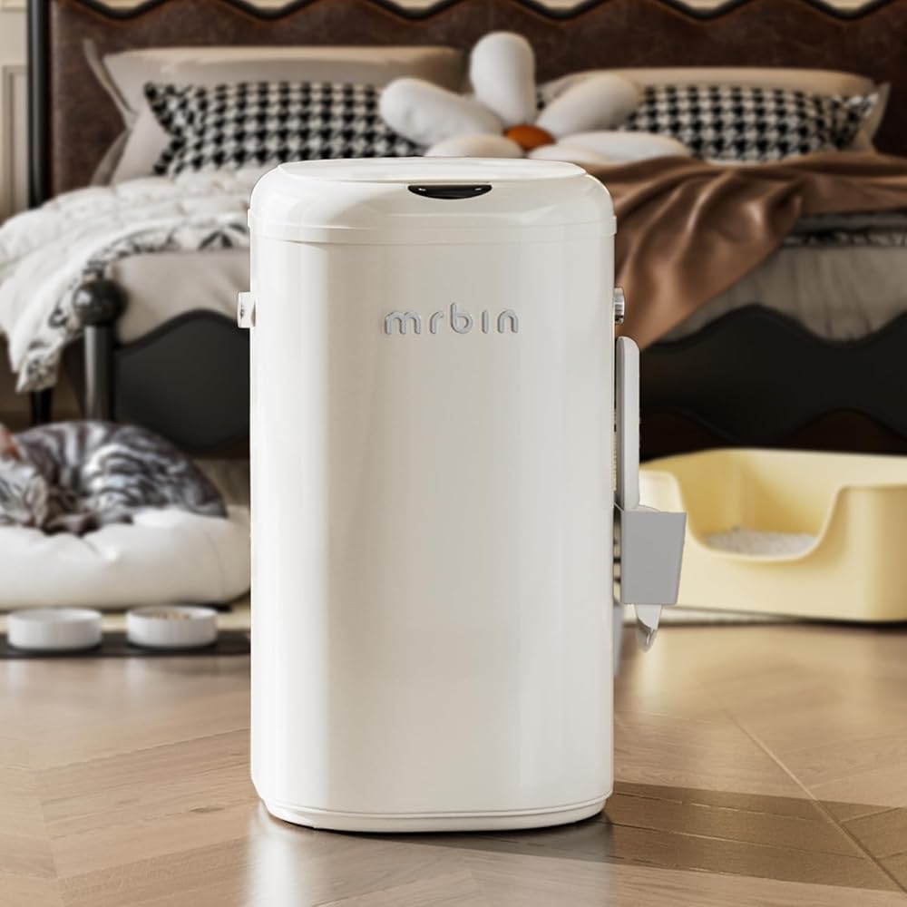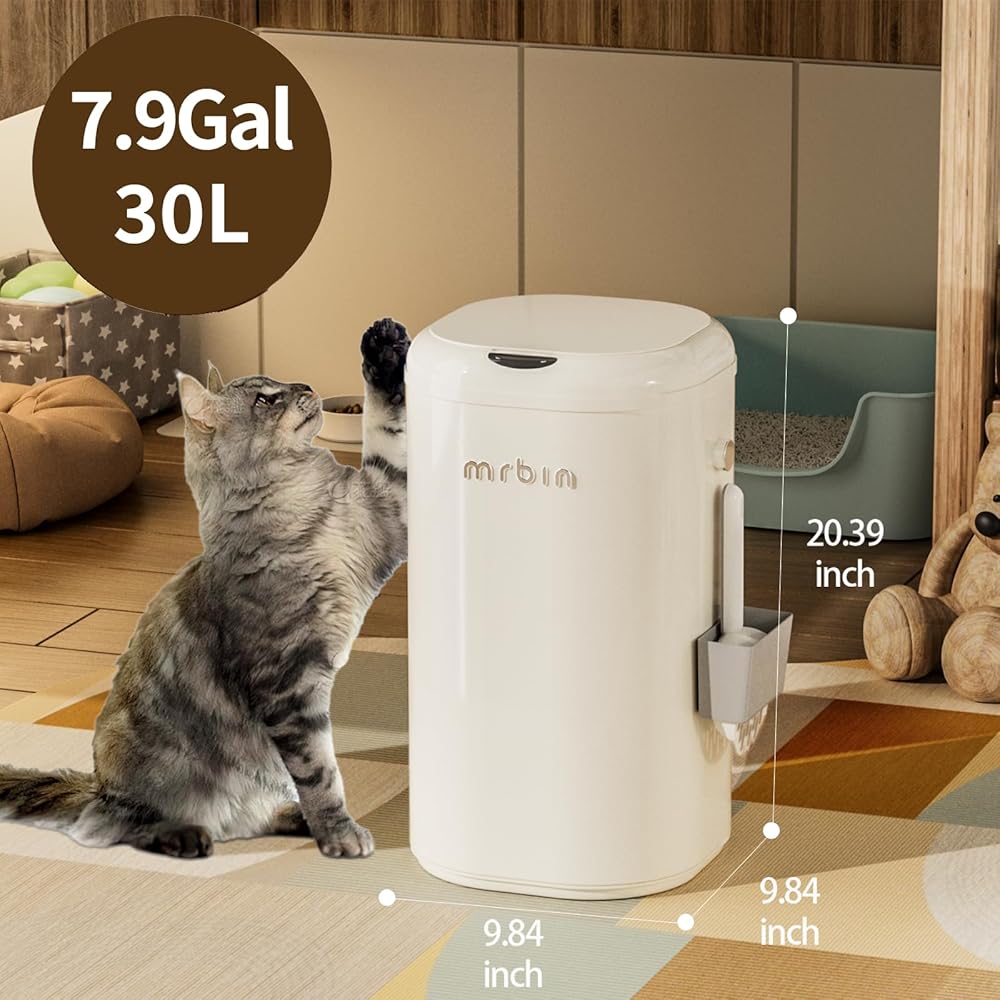 30 L Mega Capacity. 9.8" × 9.8" × 16" footprint swallows an entire 20 lb bag of litter plus daily clumps; perfect for single- or multi-cat homes and fits neatly in laundry rooms, bathrooms, or living-room corners.