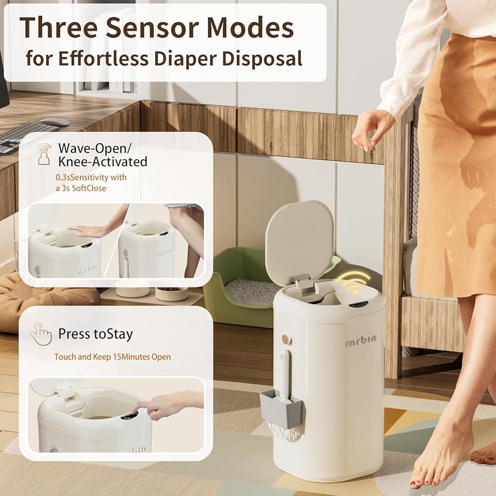 Wave-or-Knee Sensor Lid. No free hands? A simple wave of your foot or knee pops the lid open; it closes by itself seconds later, so you can scoop while holding your cat or the scoop itself.