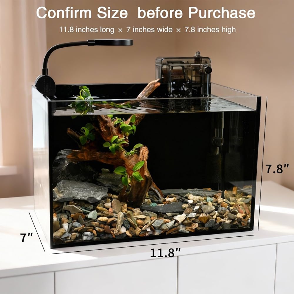 • أبعاد حوض السمك الزجاجي الشفاف (طول 11.8 بوصة × عرض 7 بوصة × ارتفاع 7.8 بوصة) يتضمن فلتر شلال واحد وضوء حوض السمك