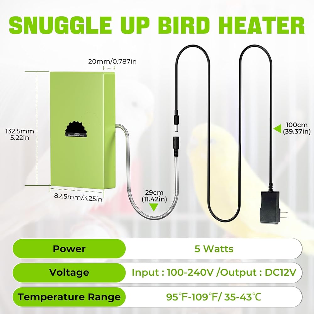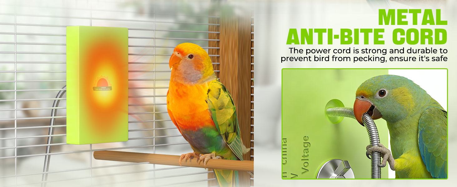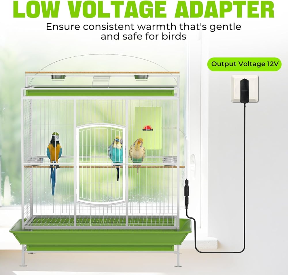 درجة حرارة ثابتة وجهد منخفض لسلامة الطيور: يحافظ السخان على نطاق درجة حرارة سطح ثابت وآمن للطيور يتراوح بين 95-109 درجة فهرنهايت (35-43 درجة مئوية). وهذا يمنع ارتفاع درجة الحرارة ويضمن منطقة مريحة باستمرار لمحبوبتك. يعمل على مخرج آمن بتيار مستمر 12 فولت، مما يقلل بشكل كبير من أي خطر، ويأتي مع أنبوب معدني متين مقاوم للمضغ لمنع الطيور من النقر.