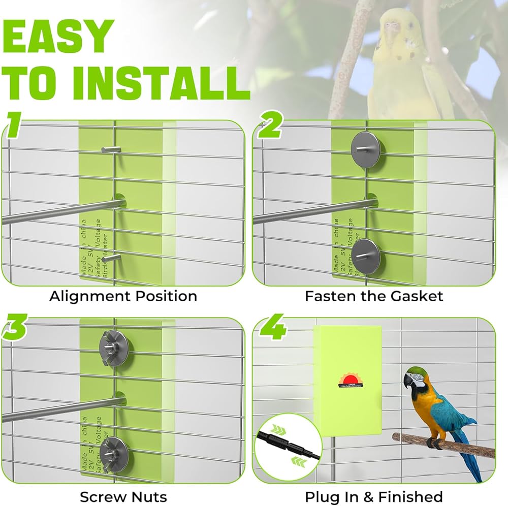 سهولة التركيب: سخان الطيور للقفص مصمم لإعداد خالٍ من المتاعب. ببساطة ضع الوسادة على جانب القفص، واستخدم الصواميل المتضمنة للحصول على ملاءمة أنيقة وآمنة. إنه جاهز لتوفير الدفء في دقائق.