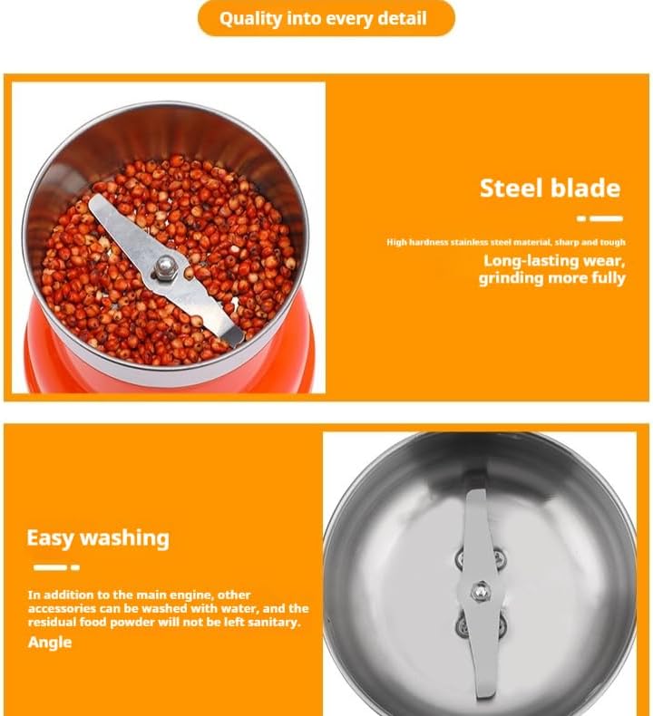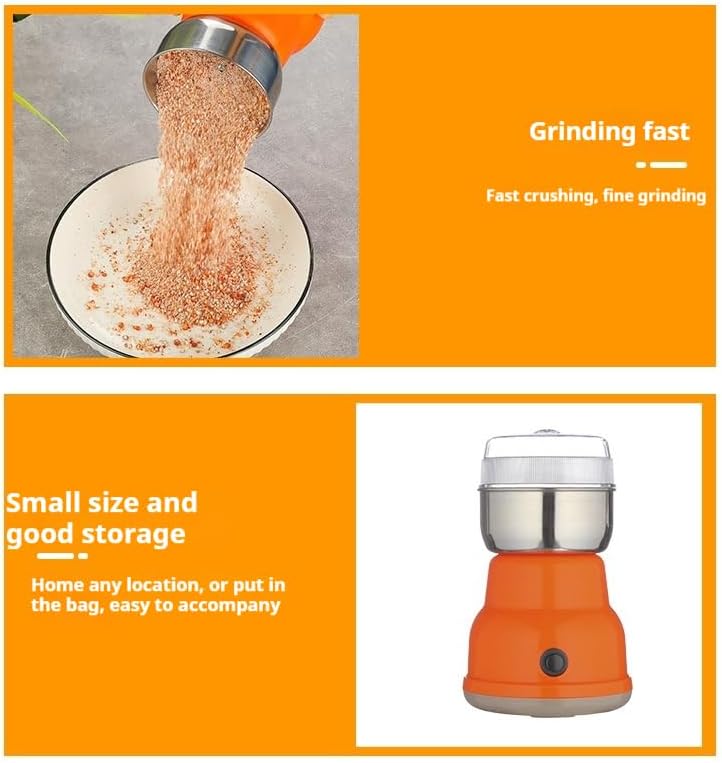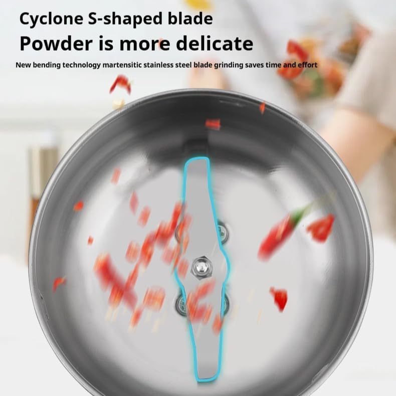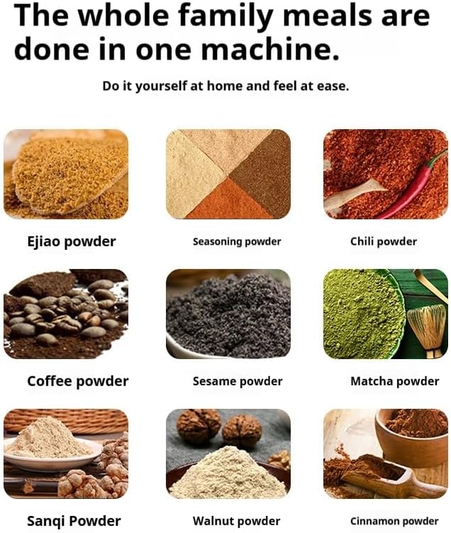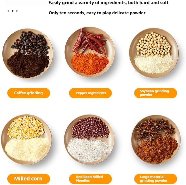 Size; Length 6.89inch Width 4.33inch High-efficiency pulverizing ability Equipped with a powerful motor and stainless steel blades, it can quickly grind Chinese herbs (e.g. astragalus, wolfberry, ginseng), grains (e.g. oatmeal, corn), coffee beans, spices, and other materials into fine powder, saving the time of manual grinding. Versatility: These machines typically offer multiple grinding fineness options to meet different grinding needs. High quality 304 stainless steel blade, safe and durable Adopting food-grade 304 stainless steel blades, with excellent wear resistance and corrosion resistance, to ensure that the crushing process is free of metal pollution, to protect food safety. Sharp blade, can efficiently crush all kinds of dry ingredients. Safety features: To ensure the safety of the user, these devices are usually equipped with a non-slip base as well as overheat protection. Some high-end models may also have an automatic shutdown feature that automatically shuts down when the internal temperature inside the machine is too high or the grinding time is too long, preventing safety incidents. It can not only be used to make herbal powder, grains powder, coffee powder, but also used to grind spices, chili powder, milk powder, auxiliary food, etc. It is suitable for health care, baking, cooking and many other life scenarios. Energy-saving and efficient: Modern household mills mostly use low-power motors, which have low noise and low energy consumption during operation. At the same time, because they are designed to complete grinding tasks quickly and efficiently, they are efficient and energy-efficient at the same time.