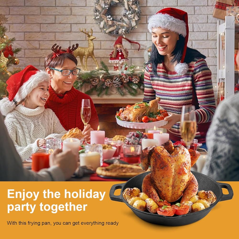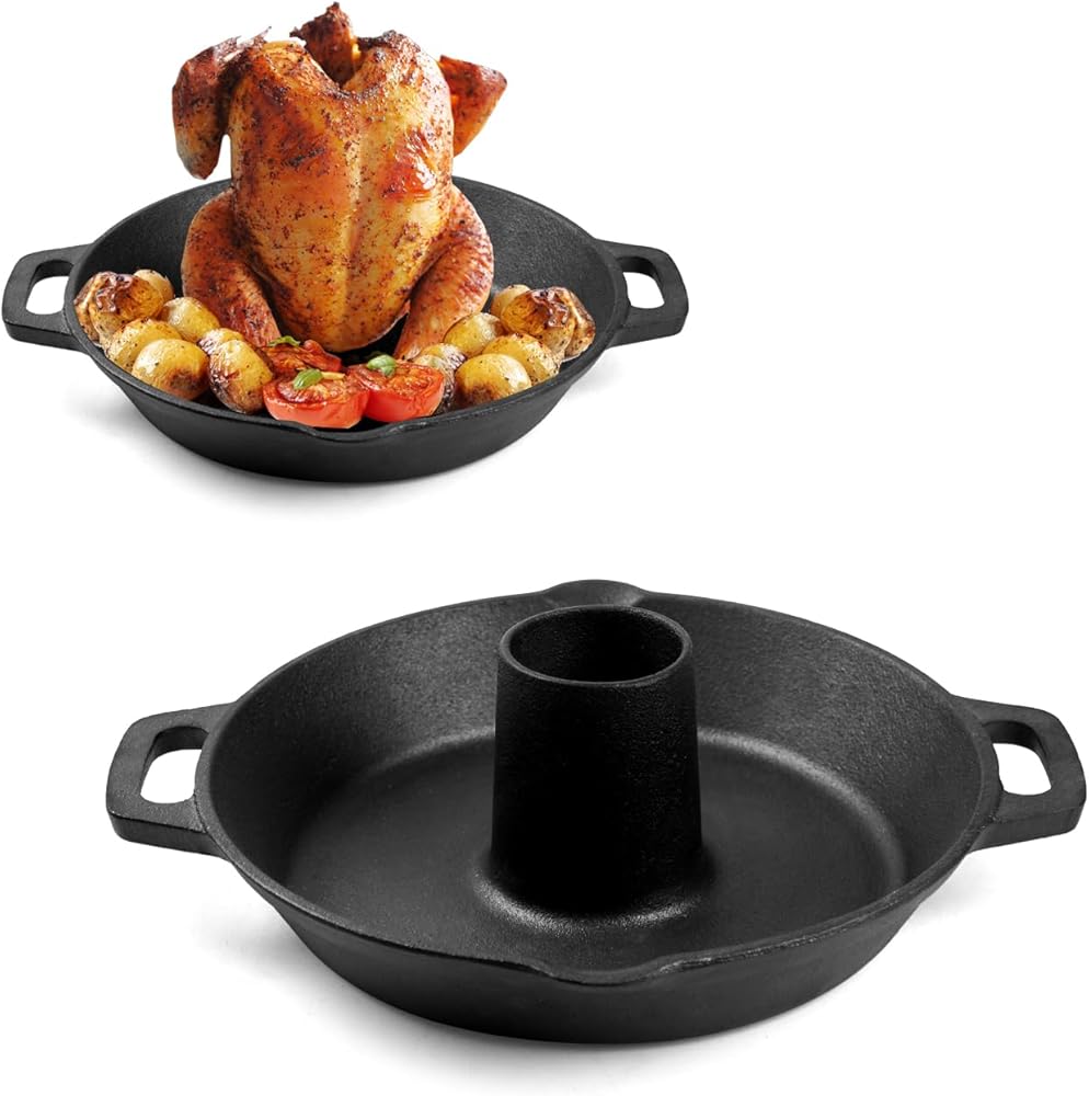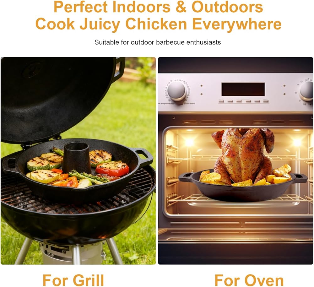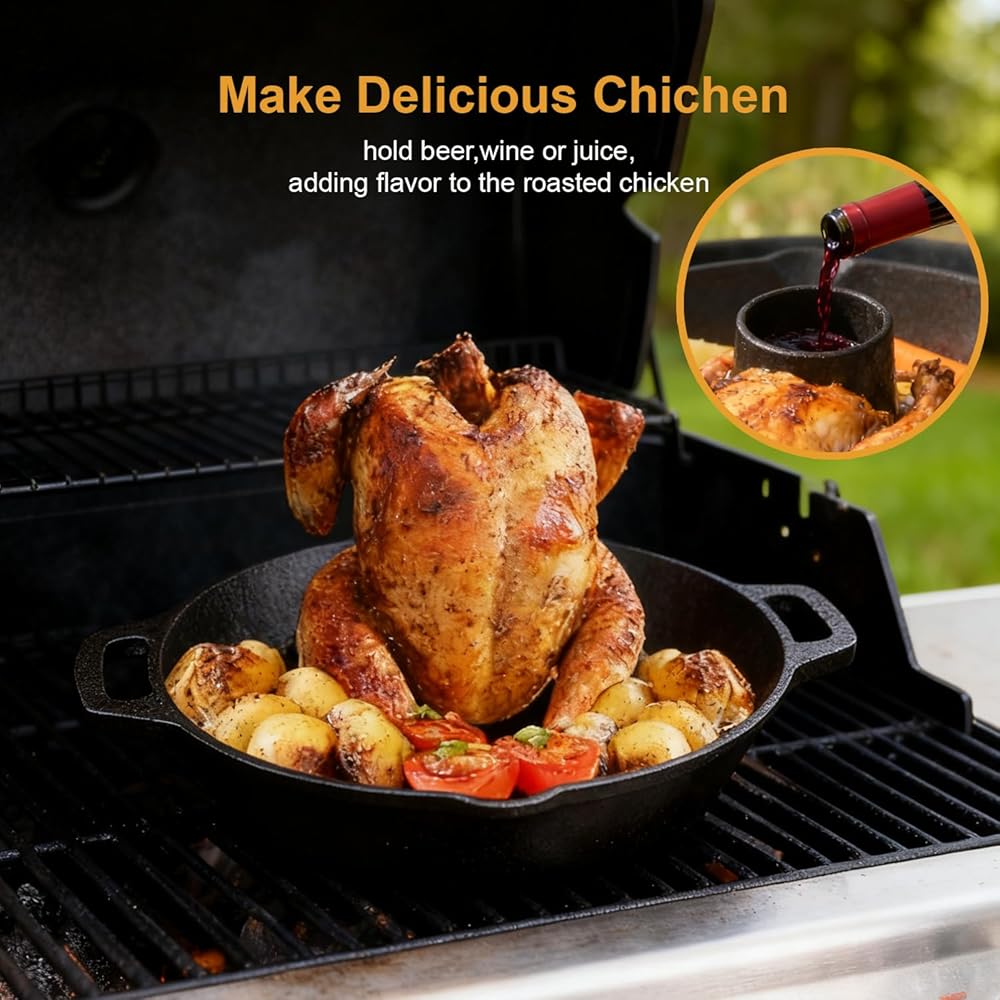 هيكل متفوق من الحديد الزهر وحتى الحرارة: مصنوع من الحديد الزهر عالي التحمل، يوفر حامل الدجاج هذا احتفاظًا فائقًا بالحرارة ويوزع درجة الحرارة بالتساوي. يؤدي ذلك إلى التخلص من البقع الساخنة، مما يضمن طهي طعامك بشكل متسق طوال الوقت، بدءًا من القشرة المقرمشة وحتى الجزء الداخلي اللذيذ.