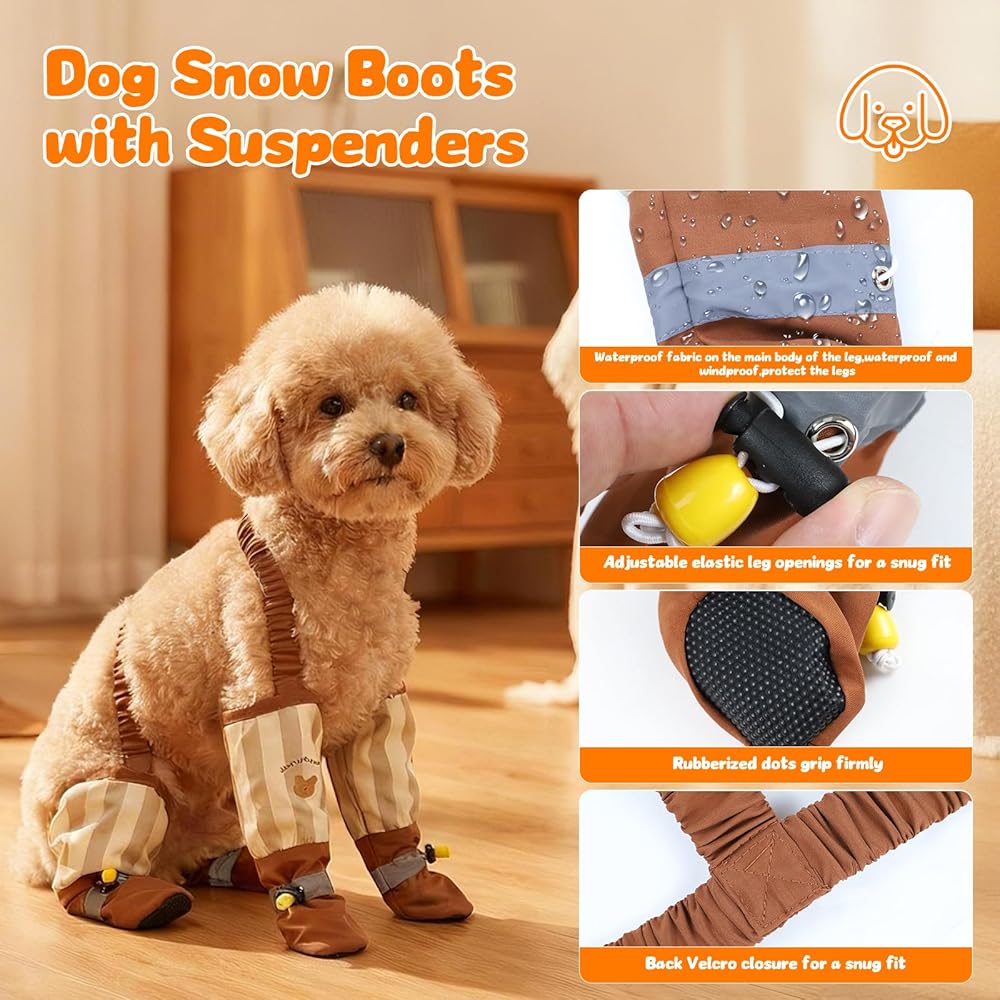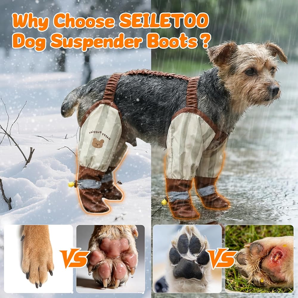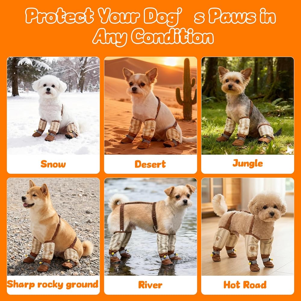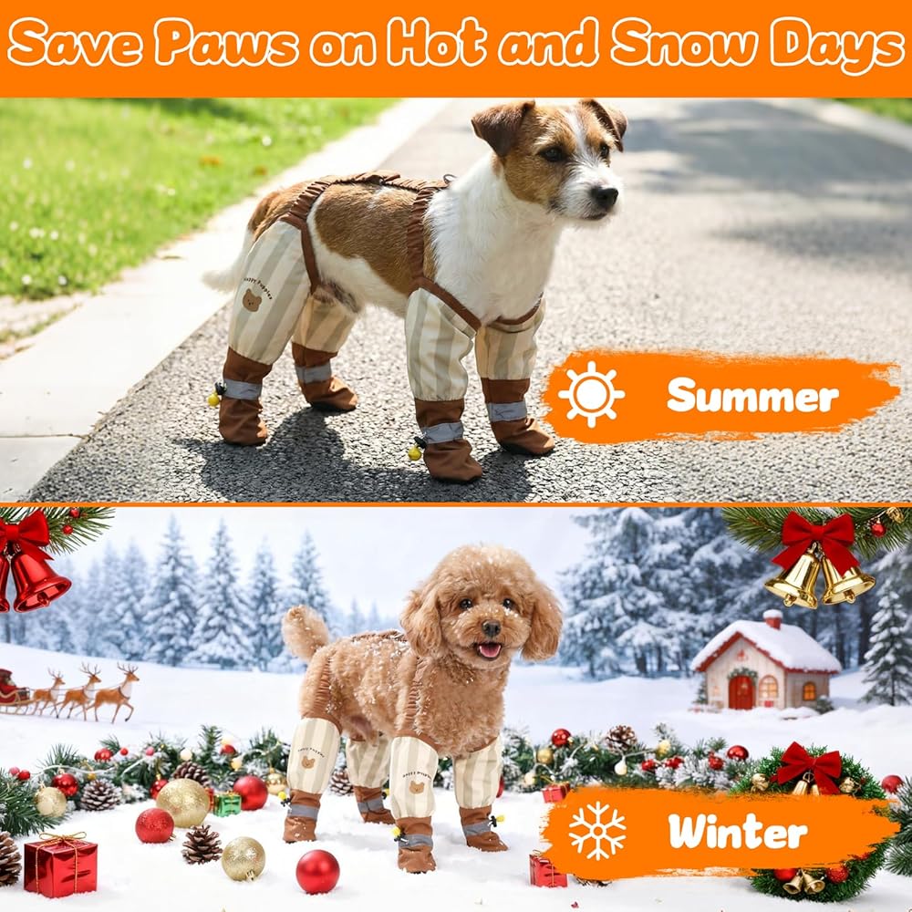 【تصميم آمن مضاد للخسارة】تتميز السراويل الضيقة للكلاب ذات الحمالات بنظام شامل من الخلف يربط جميع السراويل الأربعة، مما يضمن بقاء الأحذية ثابتة بشكل آمن وعدم الانزلاق، مما يوفر حماية موثوقة للمخالب أثناء المشي أو المشي لمسافات طويلة أو المغامرات الخارجية.