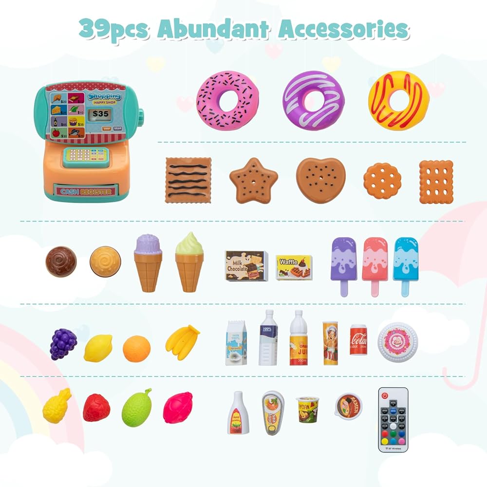 • Abundant Accessories Included: Our well-crafted supermarket playset for kids comes with a variety of accessories, including 8 fruits, 2 cakes, 3 donuts, 3 biscuit, 3 ice creams, 3 popsicles, 4 beverage bottles, 6 snacks, 6 cans and a cash register. With the included chalkboard, child can write messages while taking a break from construction.