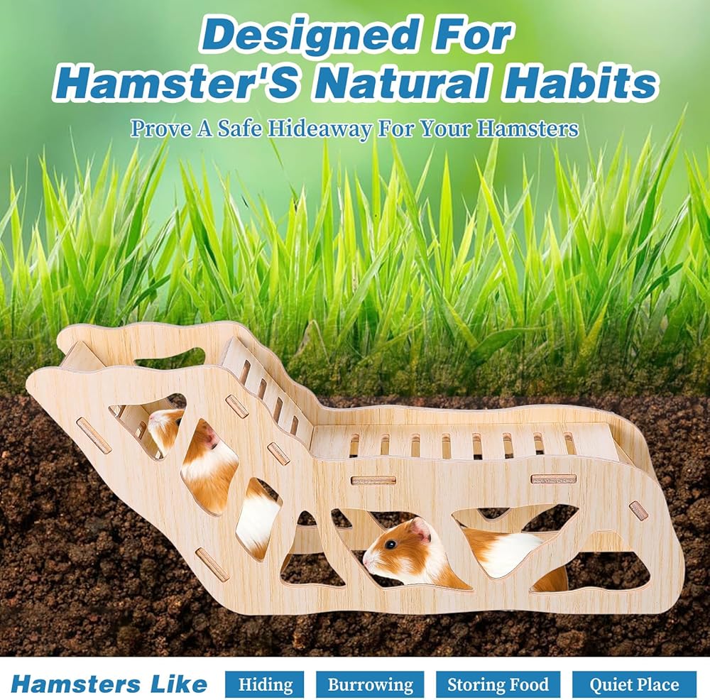 Easy to Assemble and Clean: The wooden hamster house requires no tools and can be quickly assembled in 60 seconds. Its bottomless design makes daily cleaning exceptionally easy, maintaining hygiene effortlessly. The natural pine material is not only safe and chew-resistant but also serves as a fun decoration for the hamster cage. Combining a climbing ladder and underground tunnel, it stimulates your pet's digging and climbing instincts and easily blends into any cage theme